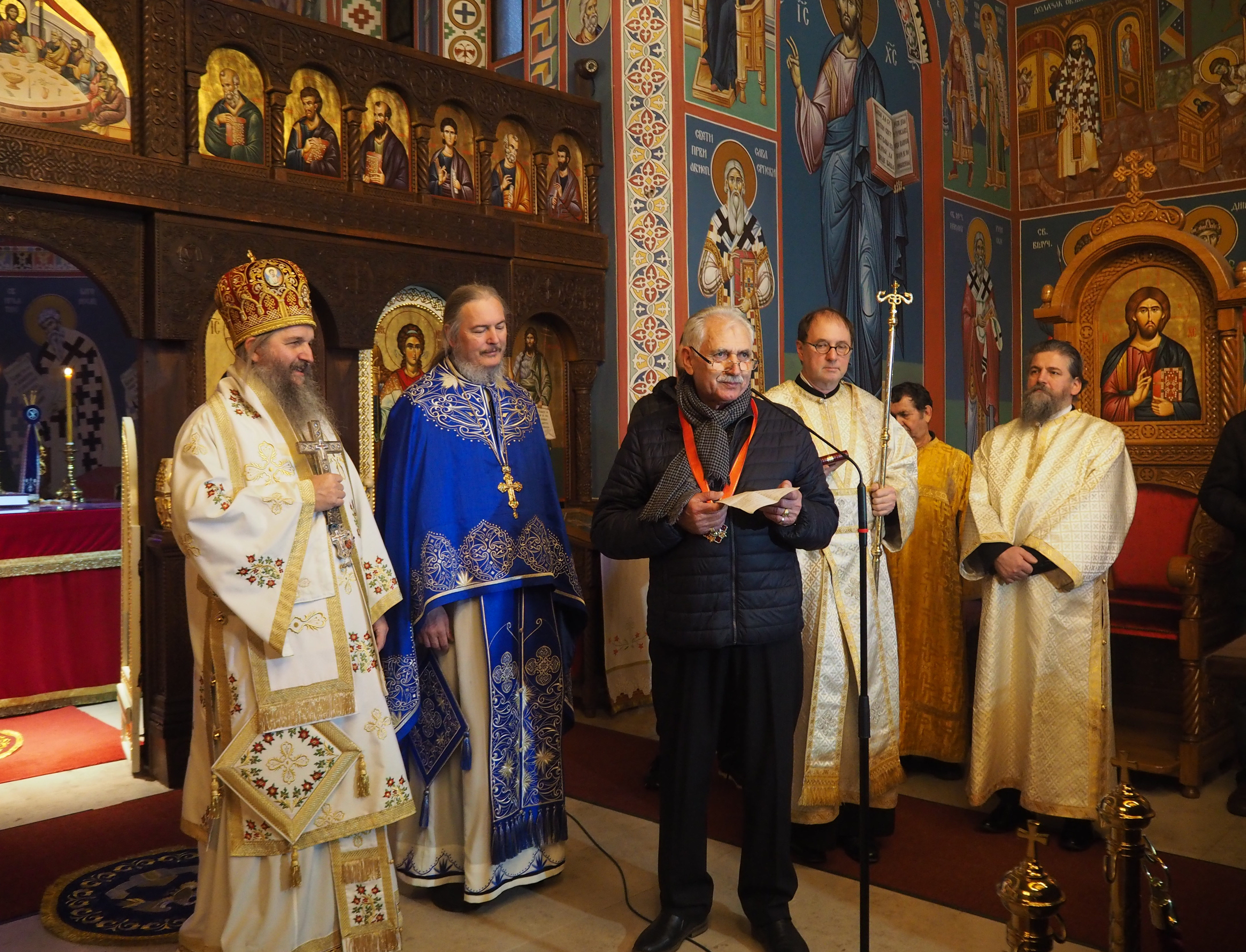 У надахнутој беседи, Епископ Андреј је поучио верни народ о потреби присуствовања на богослужењима као и о активном учешћу на истим. Није изостала ни похвала на рачун молитвене тишине за време богослужења као и устаљени ред приласка Светој Чаши. На крају је Епископ са посебним задовољством уручио орден Светог краља Милутина, Тихомиру Величковићу из Трауна за несебичну материјалну помоћ у улепшавању храма Св. Василија Острошког у Линцу. Одлуку је прочитао старешина храма прота Драган.