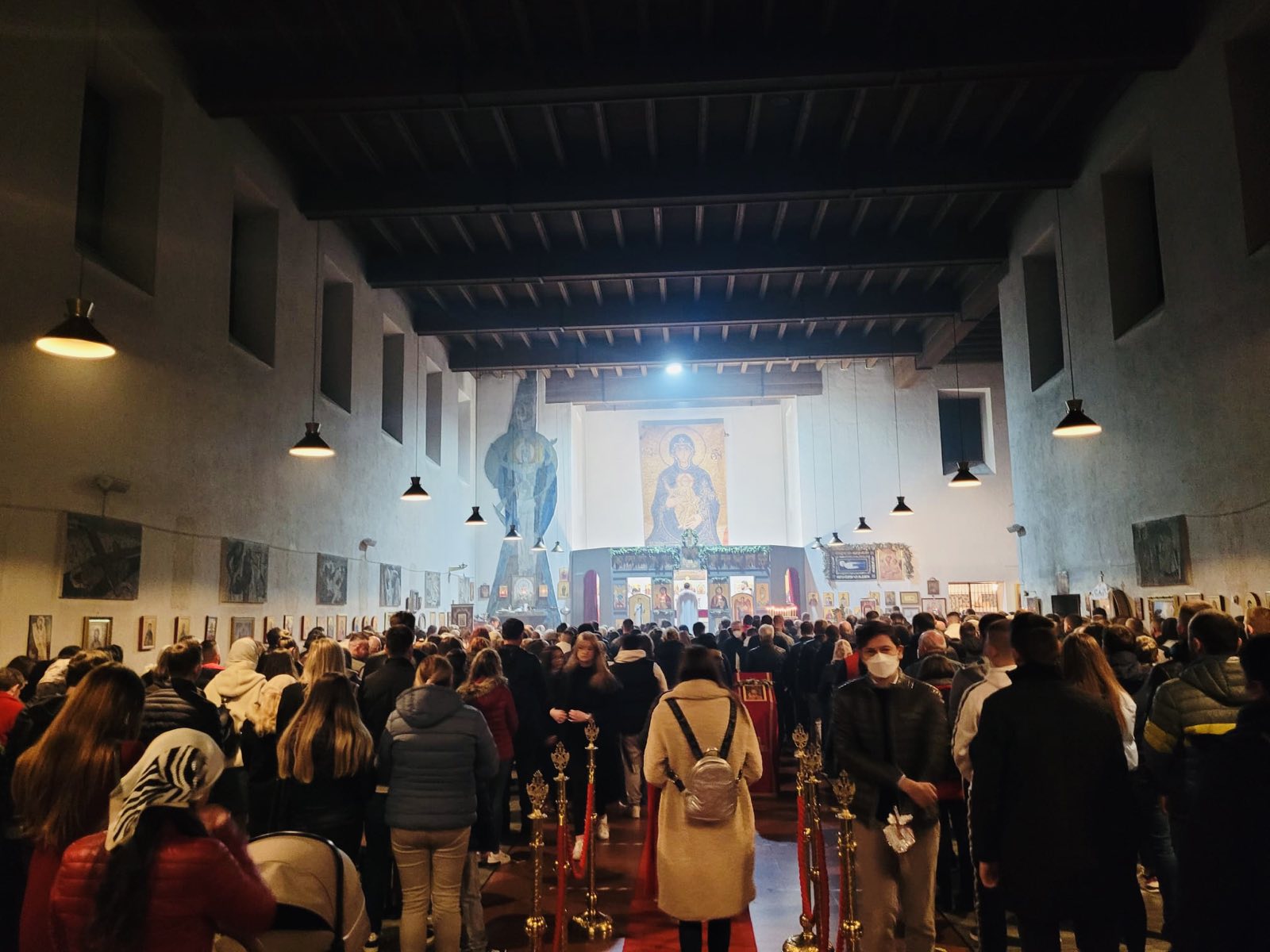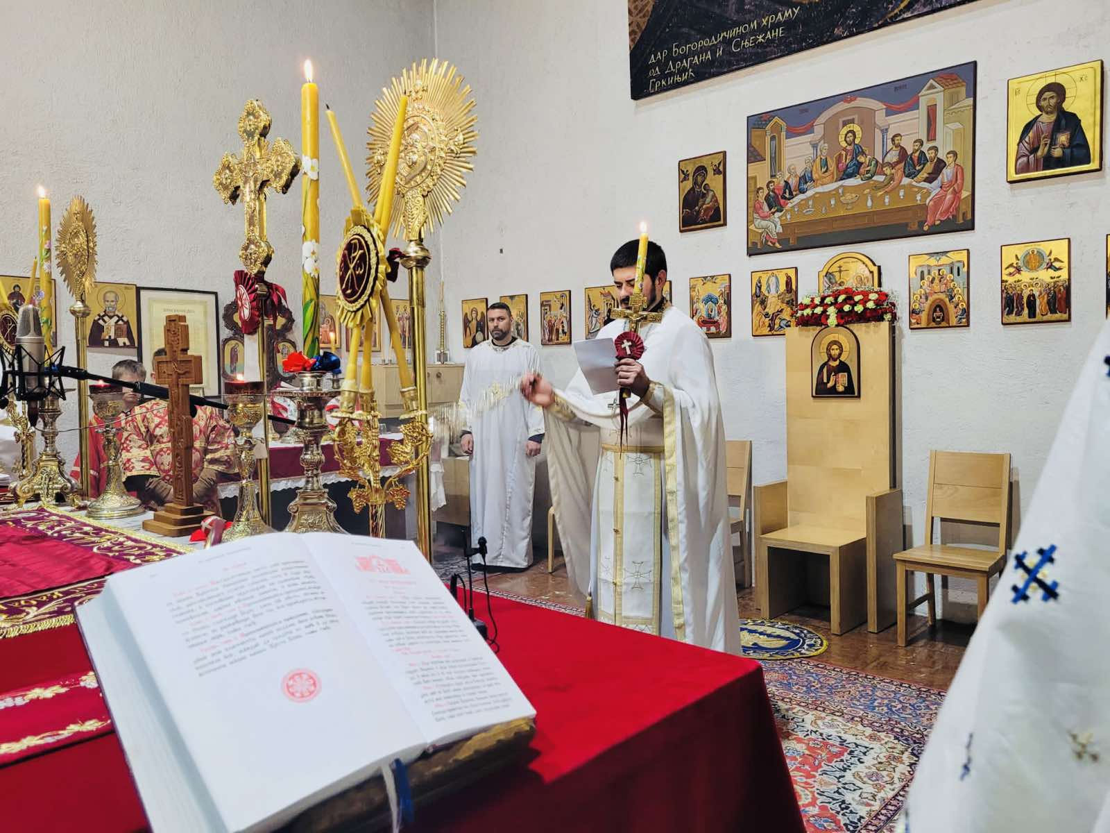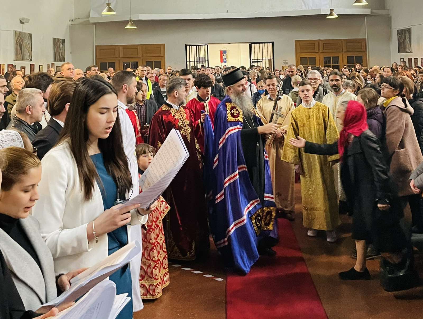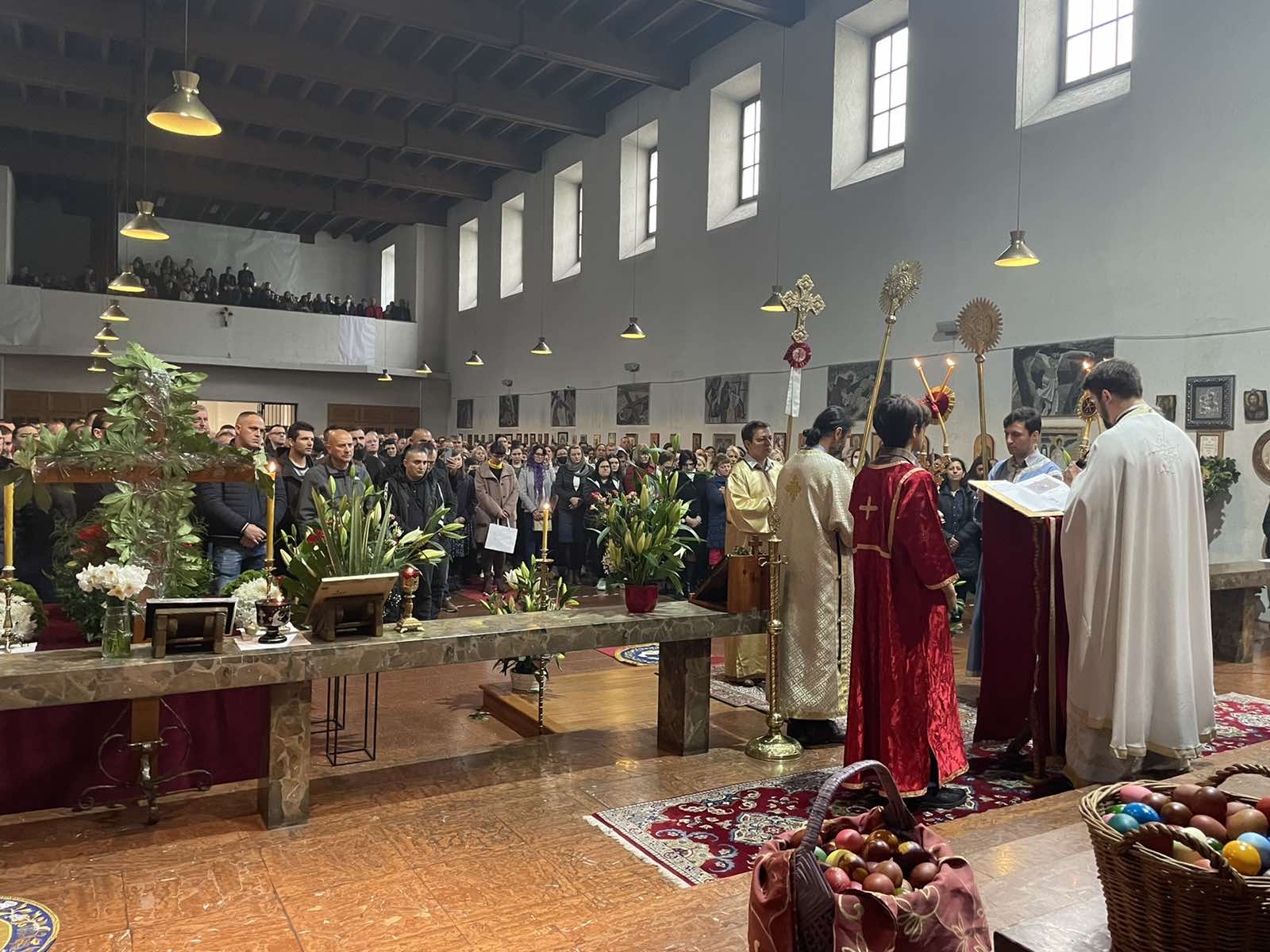Поноћна Васкршња литургија отпочета је символичним силаском Благодатног огња уз појање свечаних химни – приђите, узмите Светлост од незалазне Светлости, те је празнична радост Васкрсења већ на почетку службе испунила срце свих присутних. Свечана празнична Литургија одслужена је на више језика, јер су служби поред православних Срба и Српкиња присуствовали и верници из других православних земаља, а најпре и из Украјине. За десном певницом појали су појци при Богородичином храму, а за левом хор украјинске Православне Цркве, који су својим складним појањем допринели лепоти и динамичности богослужбеног појања, тиме показавши да вера у Васкрслог Христа не познаје нити језичне нити било које друге баријере или ограничења. За време службе прочитана је и Васкршња посланица Његове Светости Патријарха Српског Господина Господина Порфирија. На крају Литургије свештеници су на више језика поздравили присутни народ и честитали празник Пасхе, пожелевши им радост, благослов и мир од Господа, у духу празника Васкрсења који и јесте празник истинске радости, наде и вечног, нетрулежног Живота – Данас Христос као Сунце засија из гроба, данас грану пролеће у душама нашим.