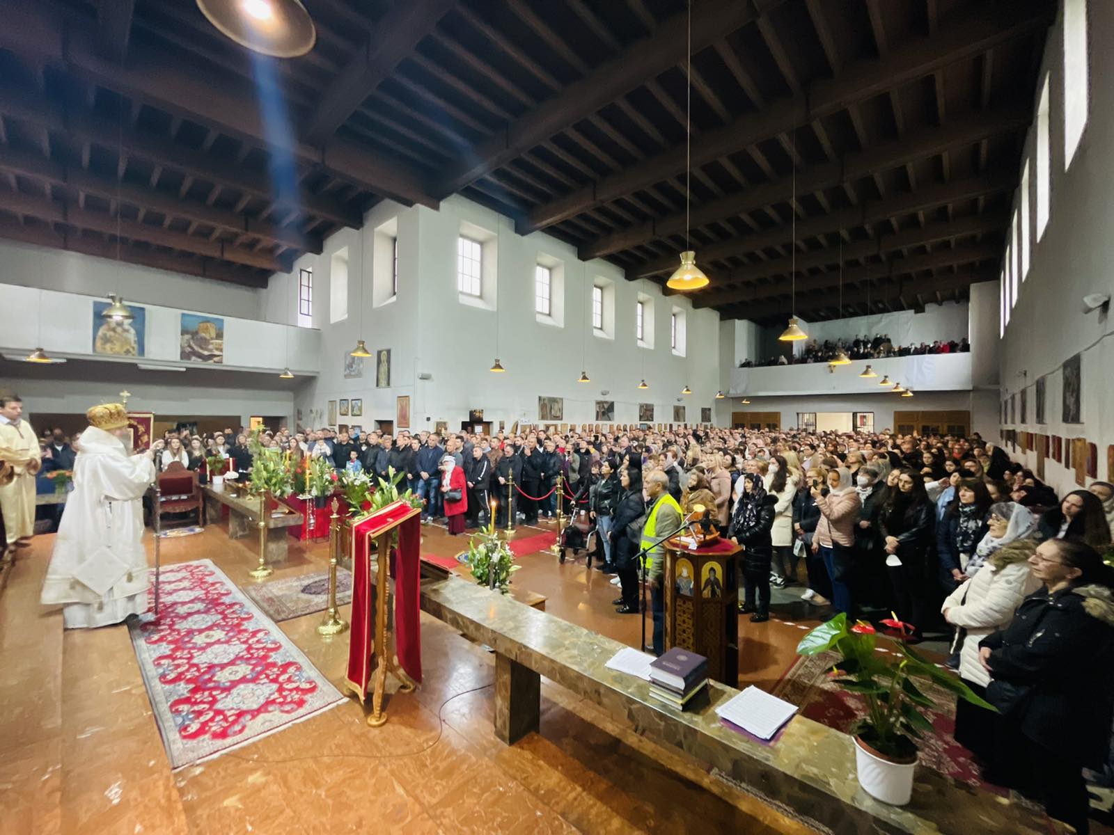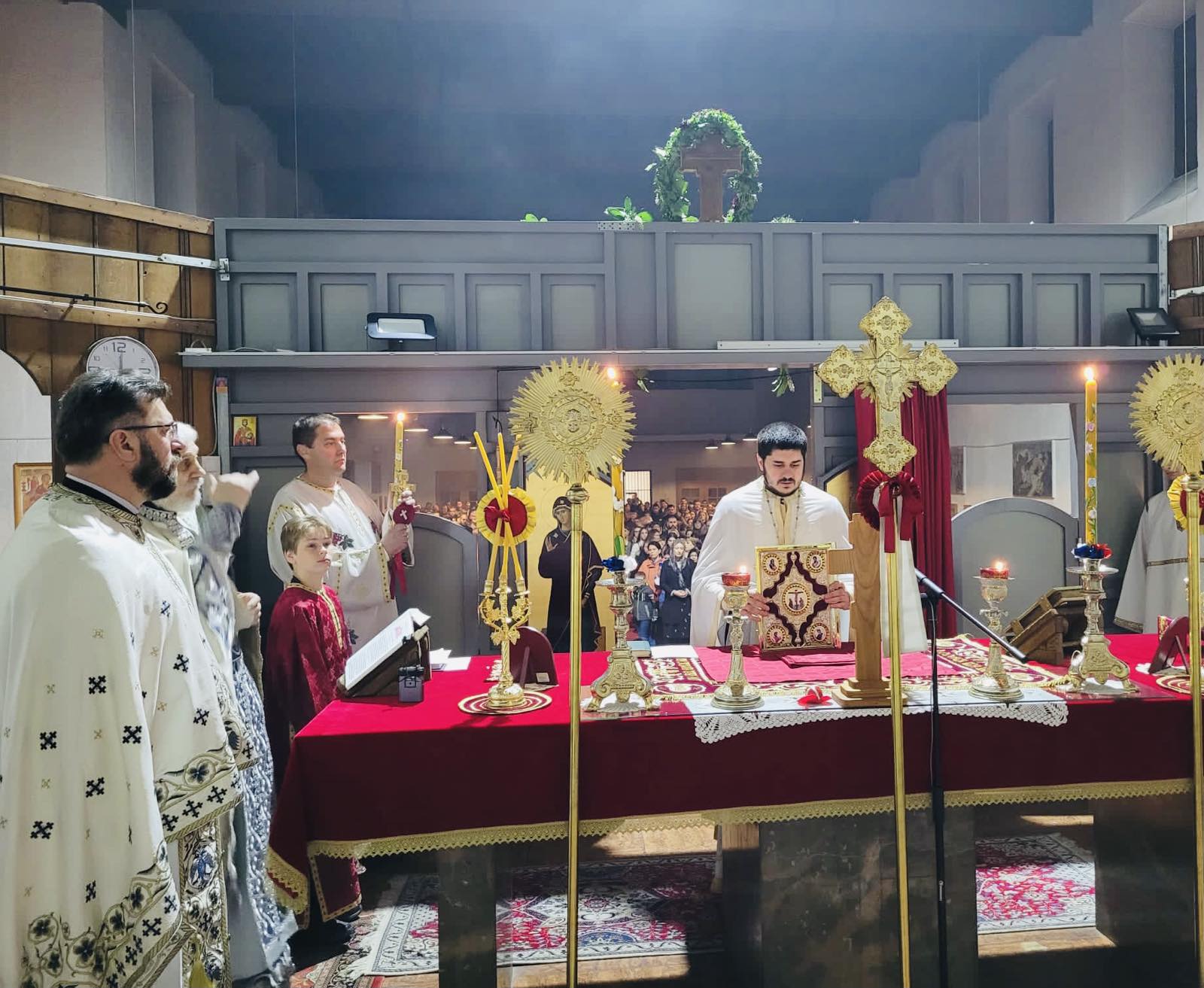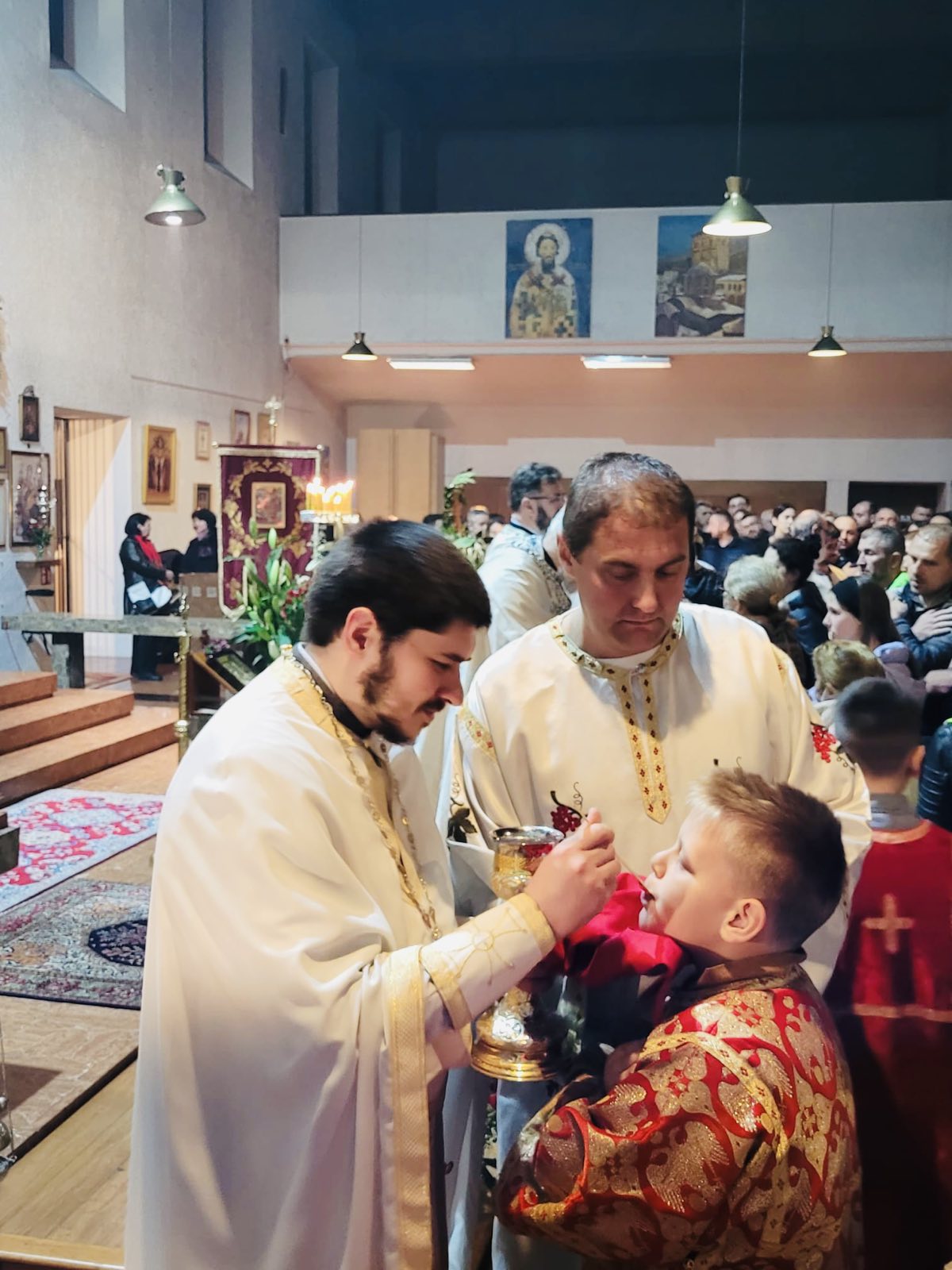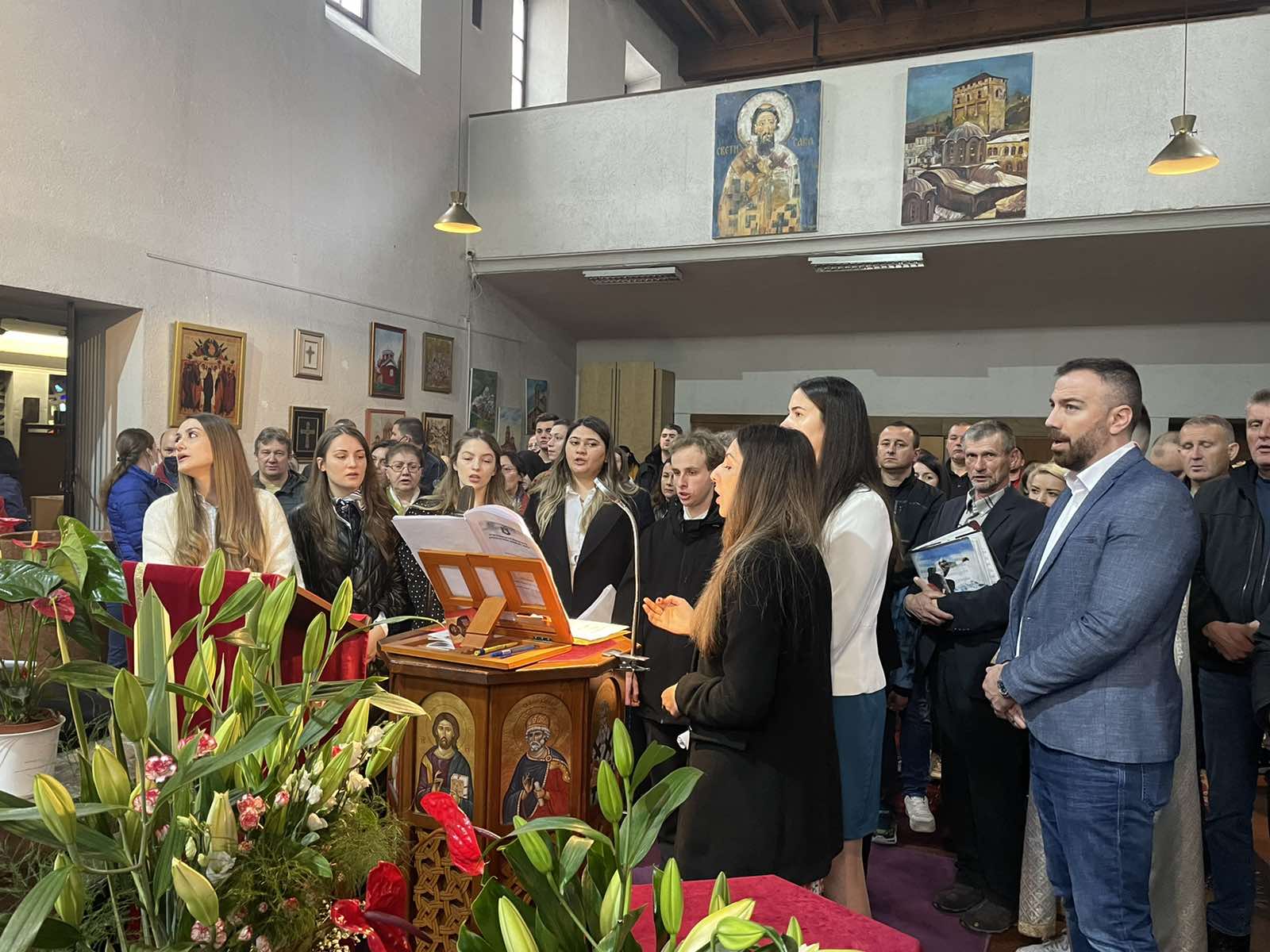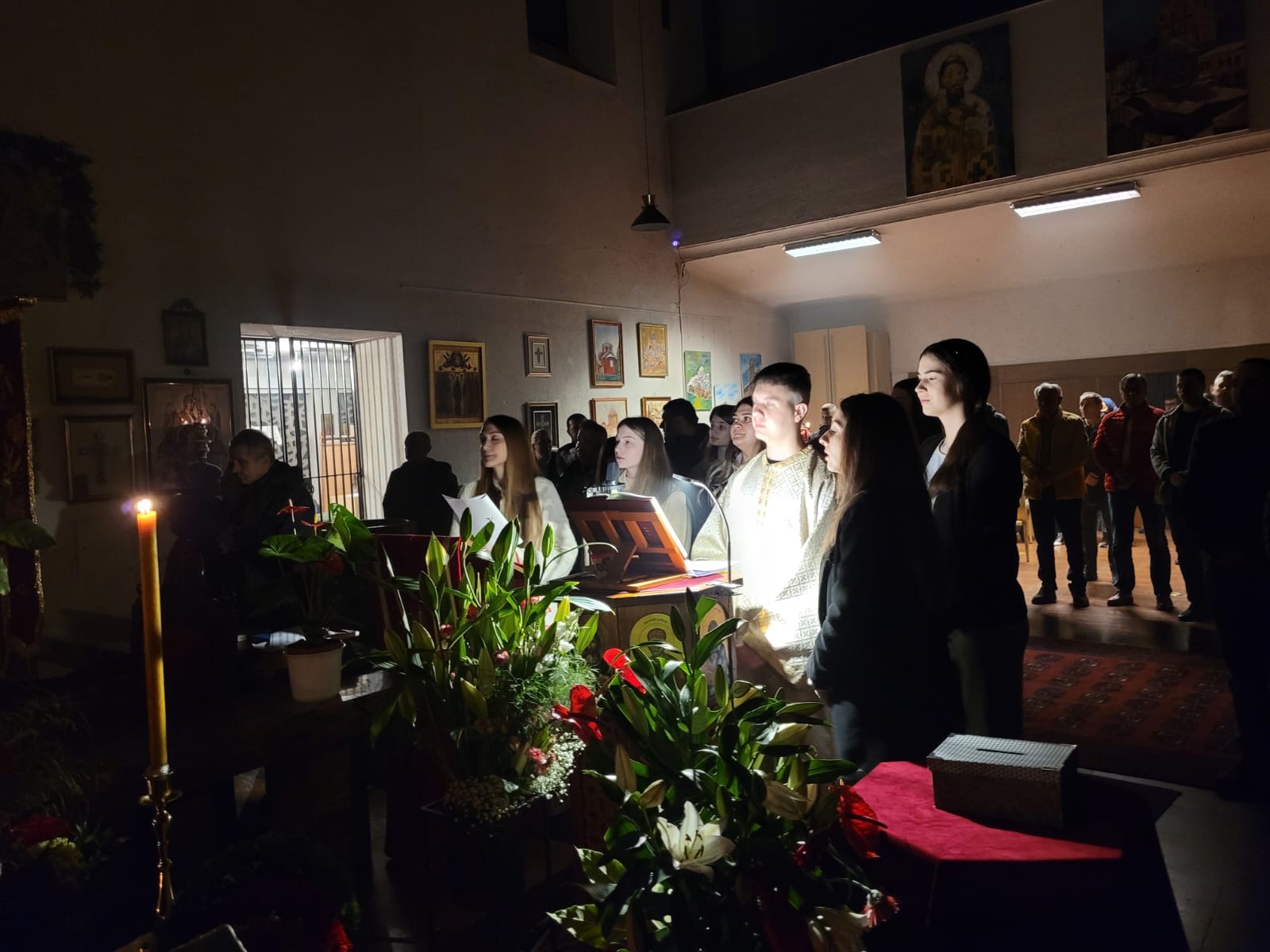 Поноћна Васкршња литургија отпочета је символичним силаском Благодатног огња уз појање свечаних химни – приђите, узмите Светлост од незалазне Светлости, те је празнична радост Васкрсења већ на почетку службе испунила срце свих присутних. Свечана празнична Литургија одслужена је на више језика, јер су служби поред православних Срба и Српкиња присуствовали и верници из других православних земаља, а најпре и из Украјине. За десном певницом појали су појци при Богородичином храму, а за левом хор украјинске Православне Цркве, који су својим складним појањем допринели лепоти и динамичности богослужбеног појања, тиме показавши да вера у Васкрслог Христа не познаје нити језичне нити било које друге баријере или ограничења. За време службе прочитана је и Васкршња посланица Његове Светости Патријарха Српског Господина Господина Порфирија. На крају Литургије свештеници су на више језика поздравили присутни народ и честитали празник Пасхе, пожелевши им радост, благослов и мир од Господа, у духу празника Васкрсења који и јесте празник истинске радости, наде и вечног, нетрулежног Живота – Данас Христос као Сунце засија из гроба, данас грану пролеће у душама нашим.