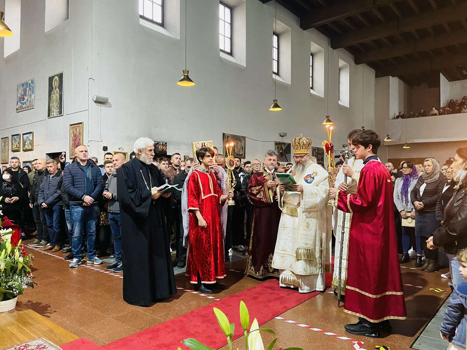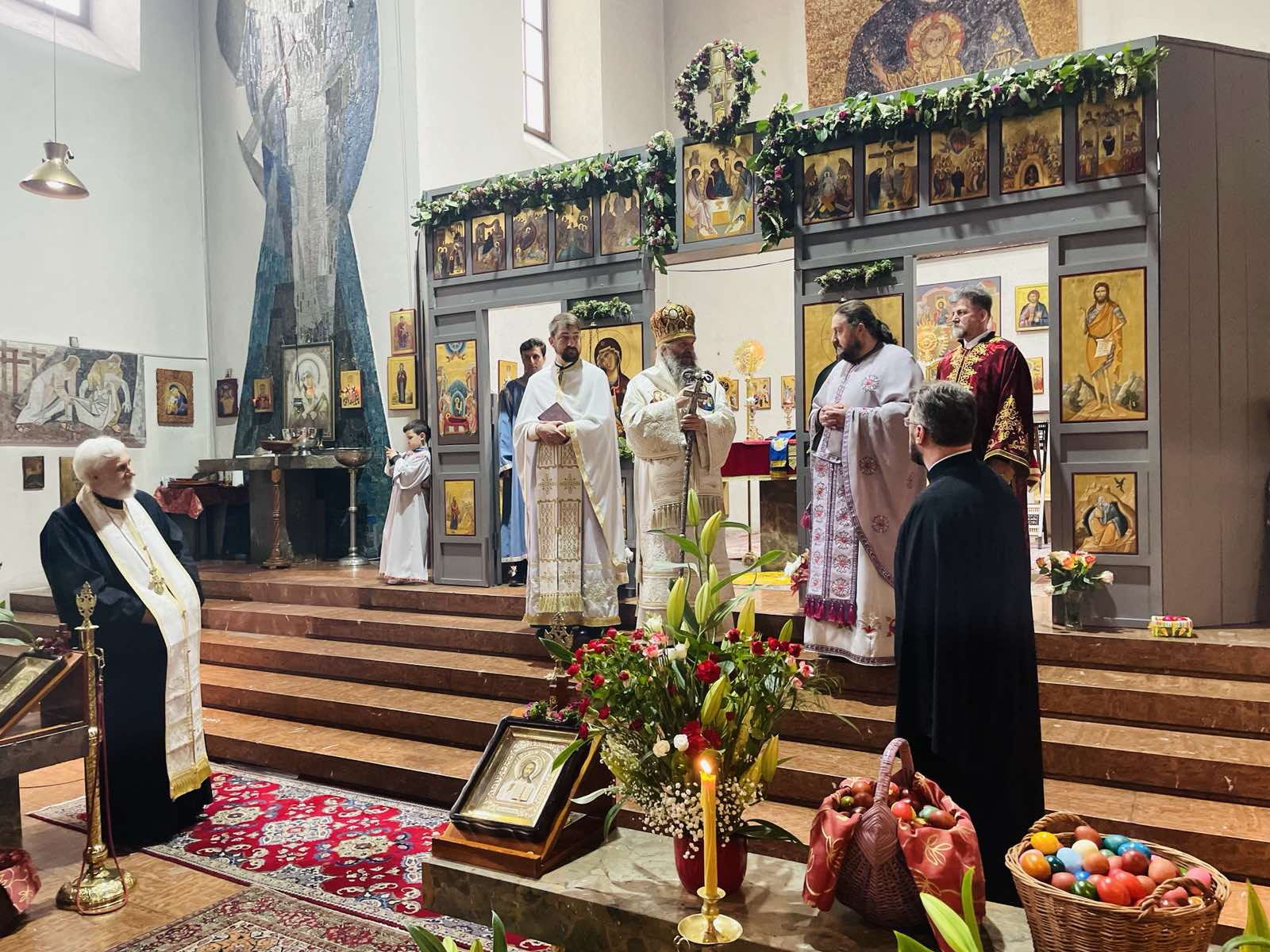 У недељу, 24. априла 2022. лета Господњег, на дан Празника над празницима, Васкрсења Господа и Спаса нашег Исуса Христа, Његово Преосвештенство Епископ аустријско-швајцарски Г. Андреј, служио је Свету архијерејску Литургију. Његовом Преосвештенству торжествено су саслуживали архијерејски намесник за Источну Аустрију, протојереј Драган Бирташевић и јереј Јован Говедарица, парох при истоименом храму. Уз присуство мноштва верног и боготражитељног народа, али и складног појања певнице Богородичиног храма, Пасха Господња прослављена је на узвишен и најсвечанији начин.