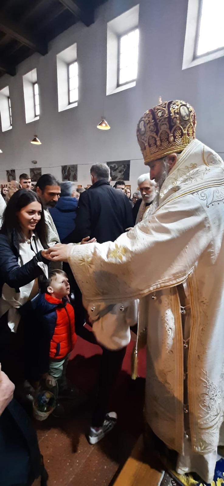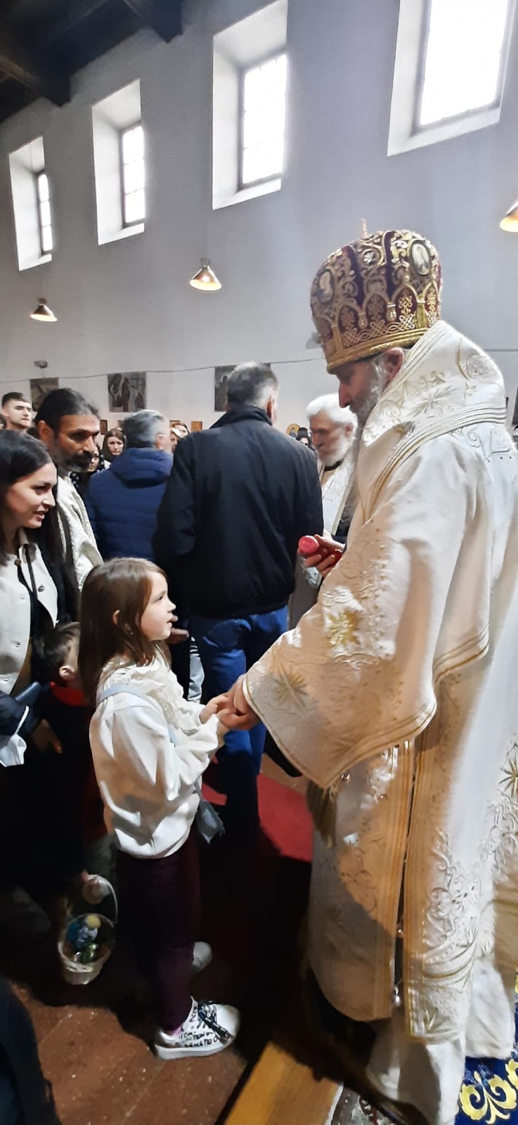 По завршетку Свете архијерејске литургије верни су пришли да узму благослов од свог Архијереја, примивши нафору и васкршње јаје, узвраћајући радосно на усклик – Христос васкрсе, ваистину васкрсе! На крају прослављене свечане службе приређено је заједничко послужење у парохијској сали, уз заједничку песму и дружење.