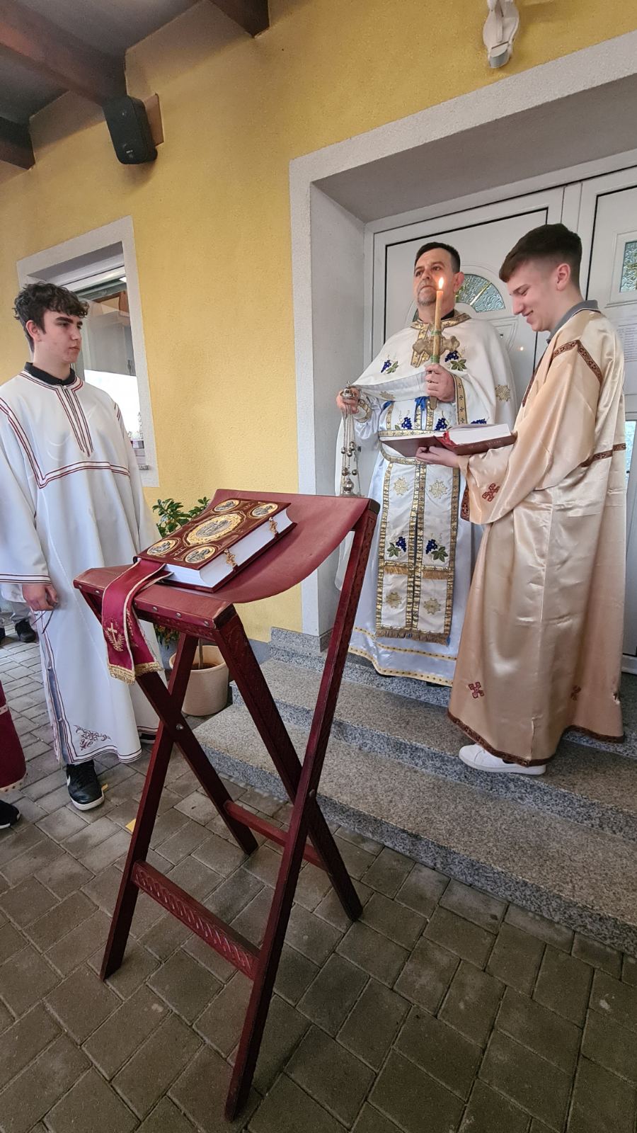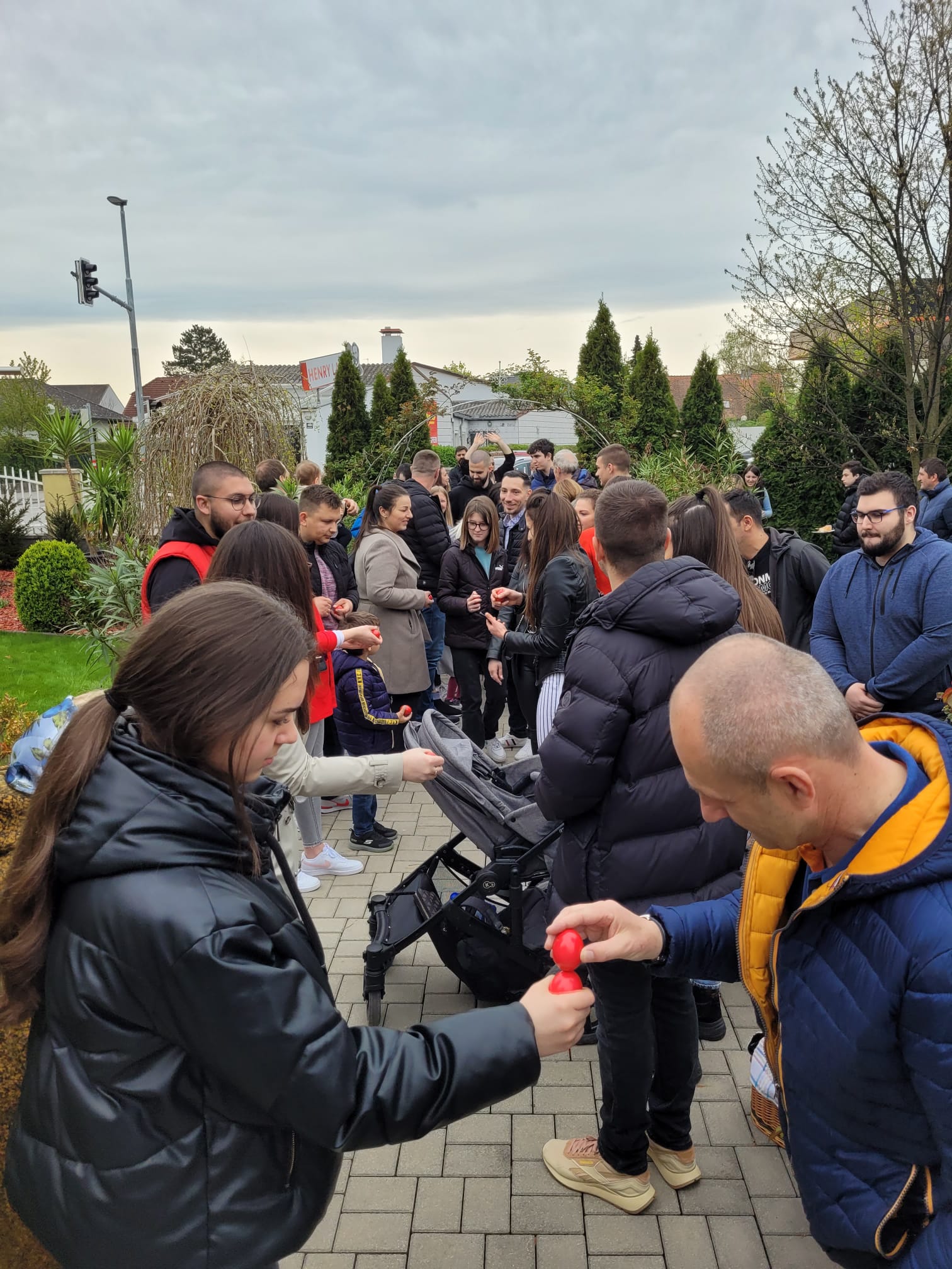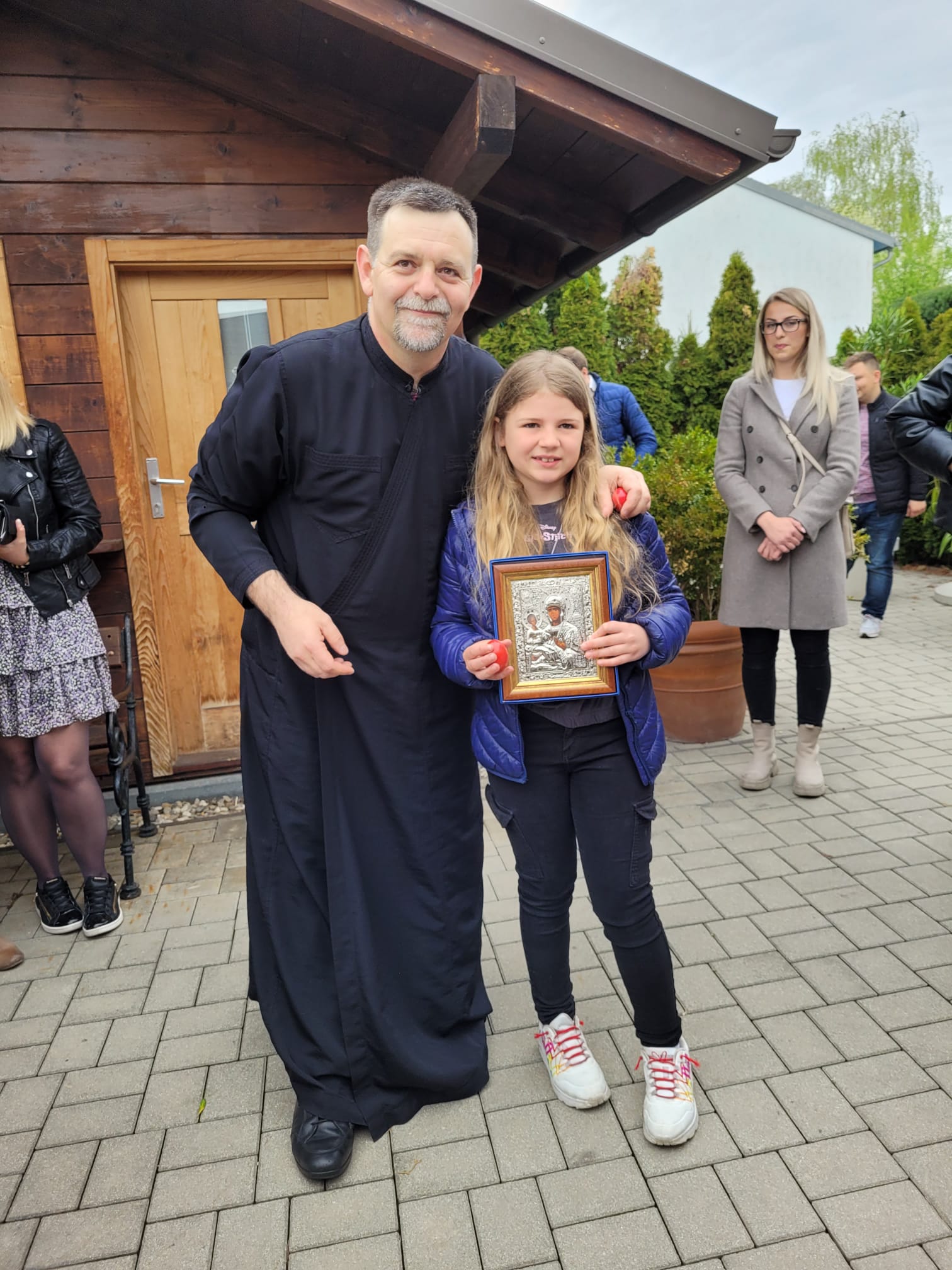 На крају Свете Литургије, отац Вељко је поздравио све са традиционалним поздравом Христос Васкрсе, и поделио васкршња јаја, а најмлађима чоколадна јаја. По Светој Литургији у порти храма организовано је такмичење у куцању јајима и изабрано најлепше офарбано јаје, а све то је допуњено весељем уз хармонику и клавијатуре које су свирали отац и син, Радоје и Емануел Лукић из Ајхграбена (Eichgraben).