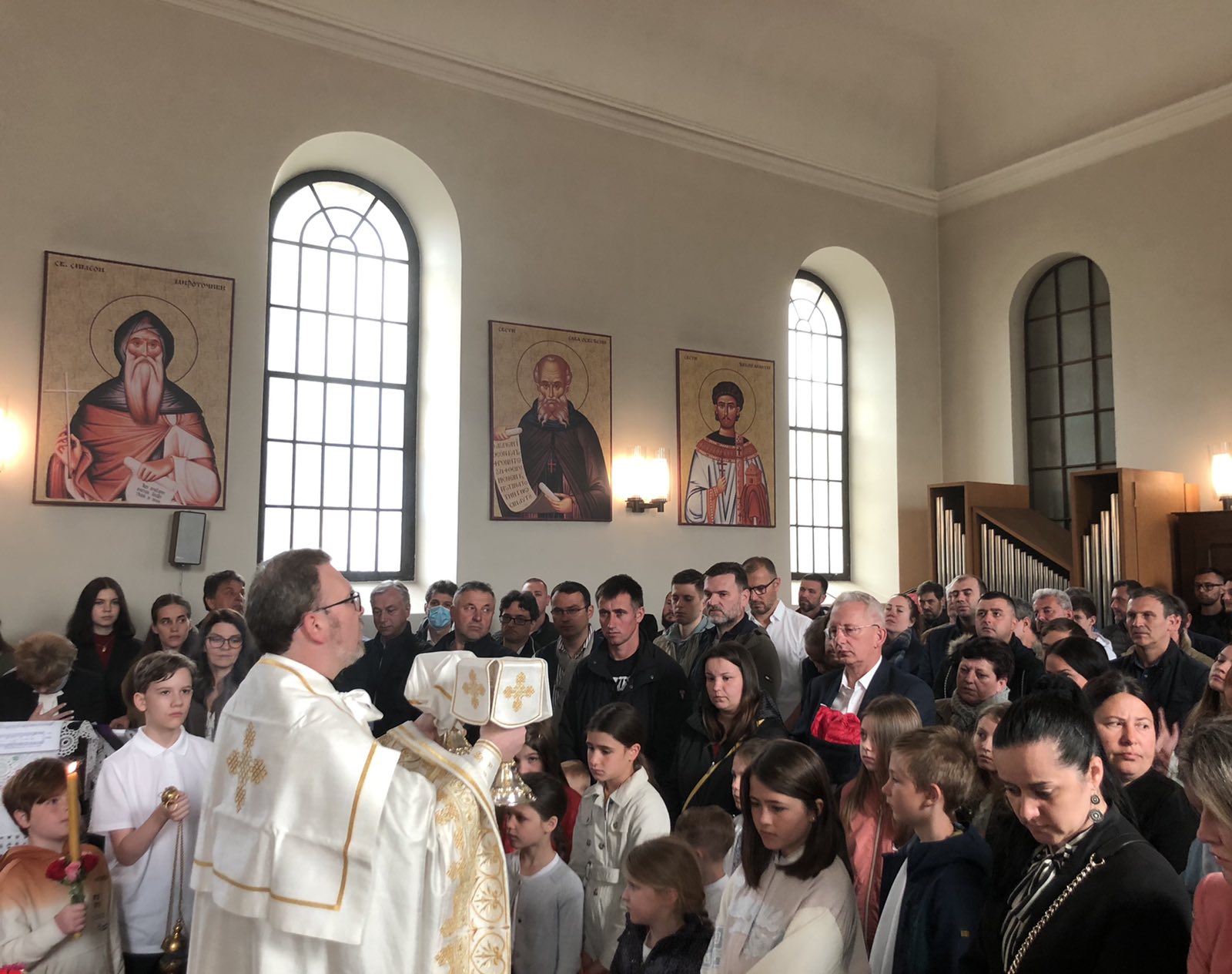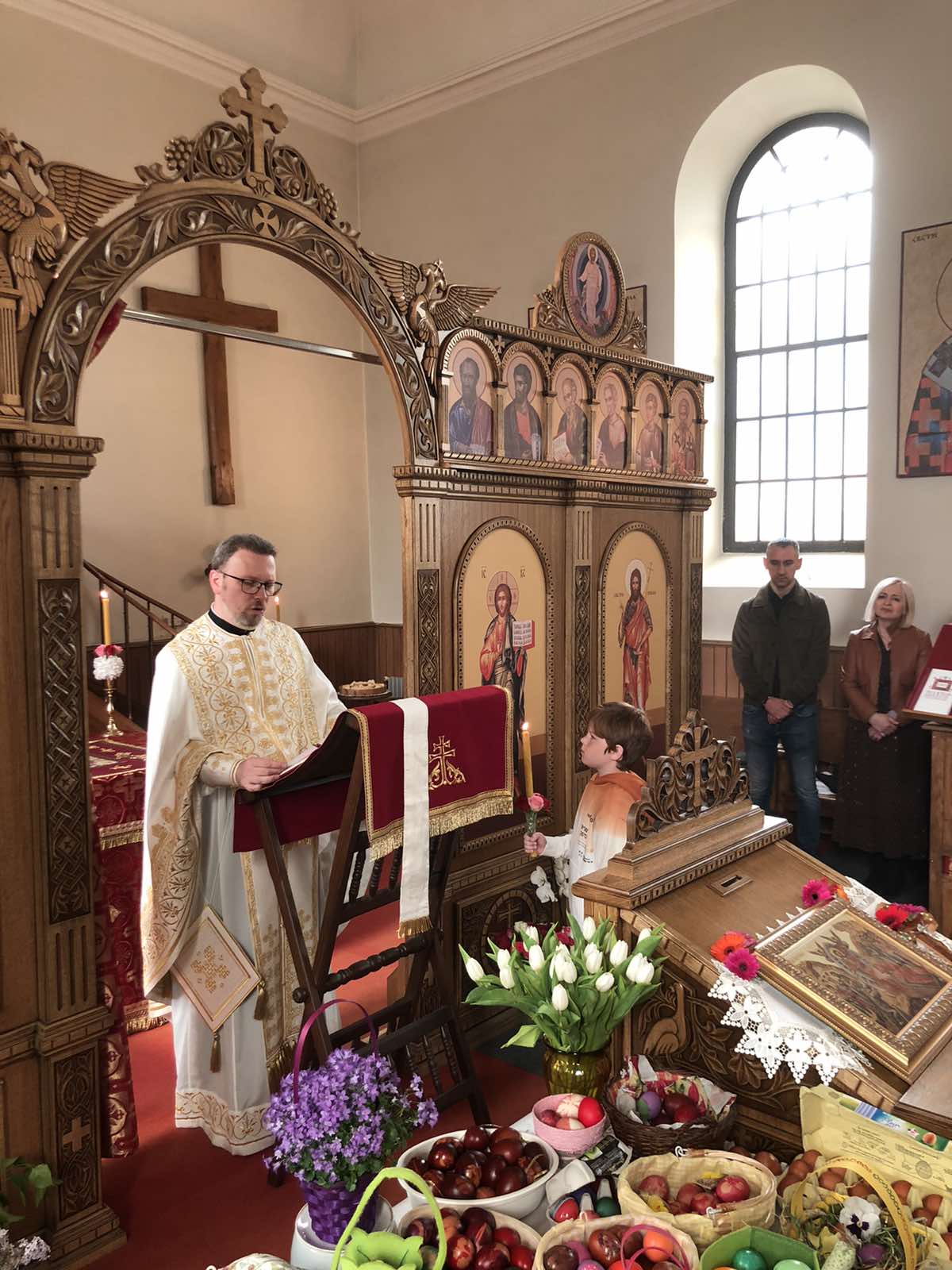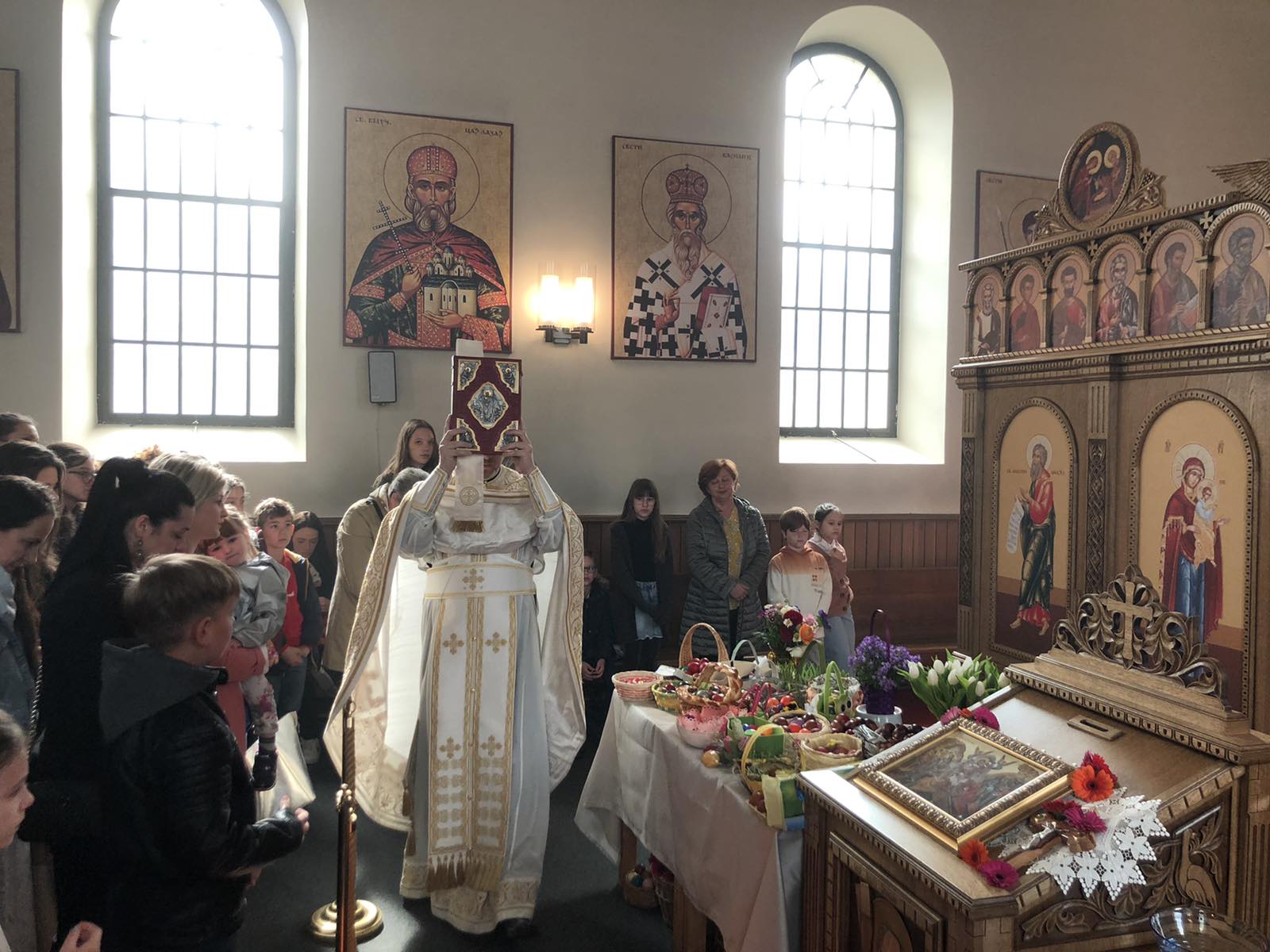 На крају литургије, отац Александар је прочитао посланицу Његове Светости Патријарха српског Г. Порфирија и пренео поздраве и благослове нашег надлежног Епископа аустријско-швајцарског Г. Андреја а затим разделио антидор и освећена јаја, уз радосни хришћански поздрав „Христос Васкрсе”. Сви присутни су затим отишли на сада већ традиционално васкршње послужење у парохијску салу, где је настављено прослављање овог најрадоснијег хришћанског Празника.