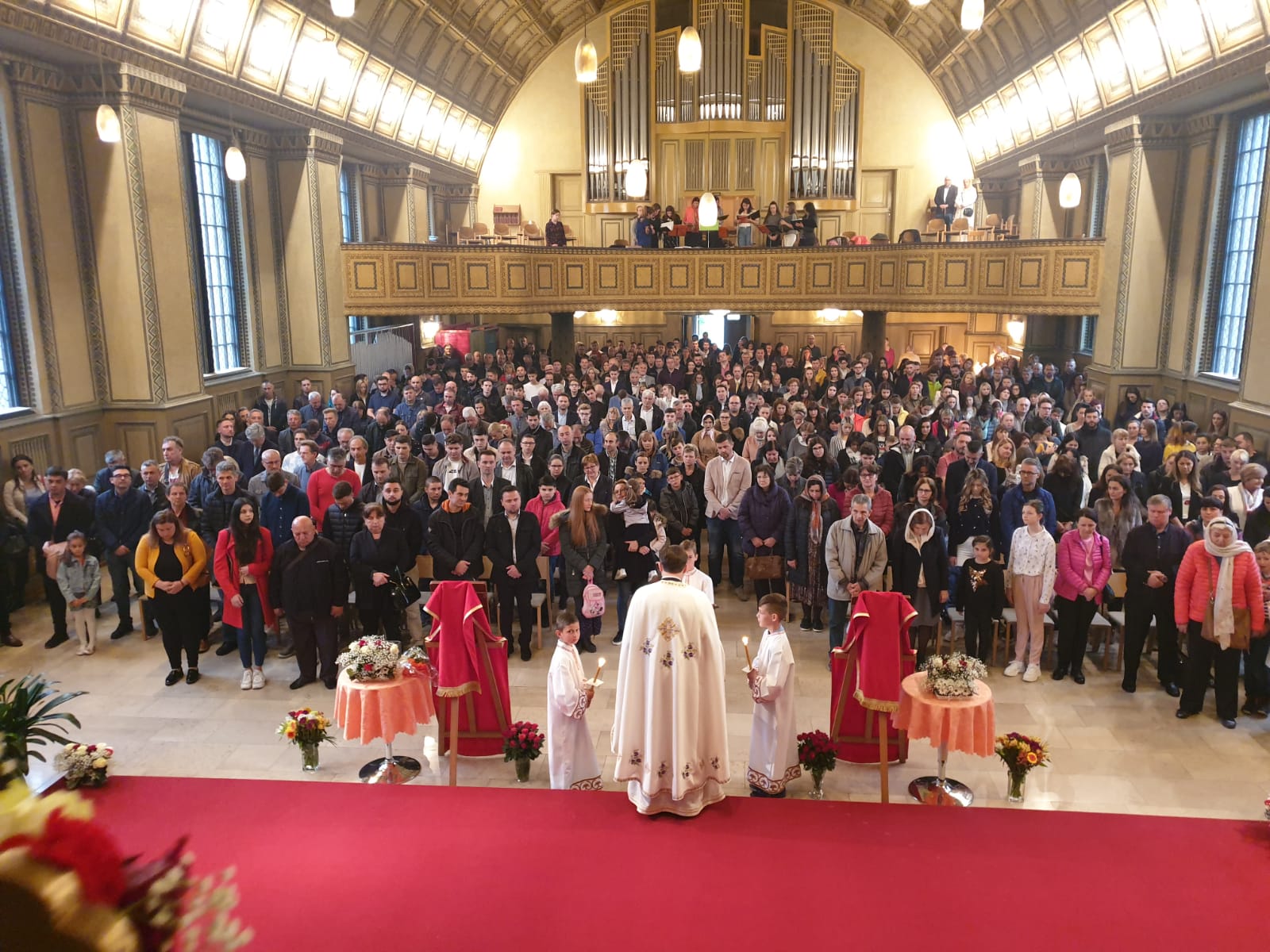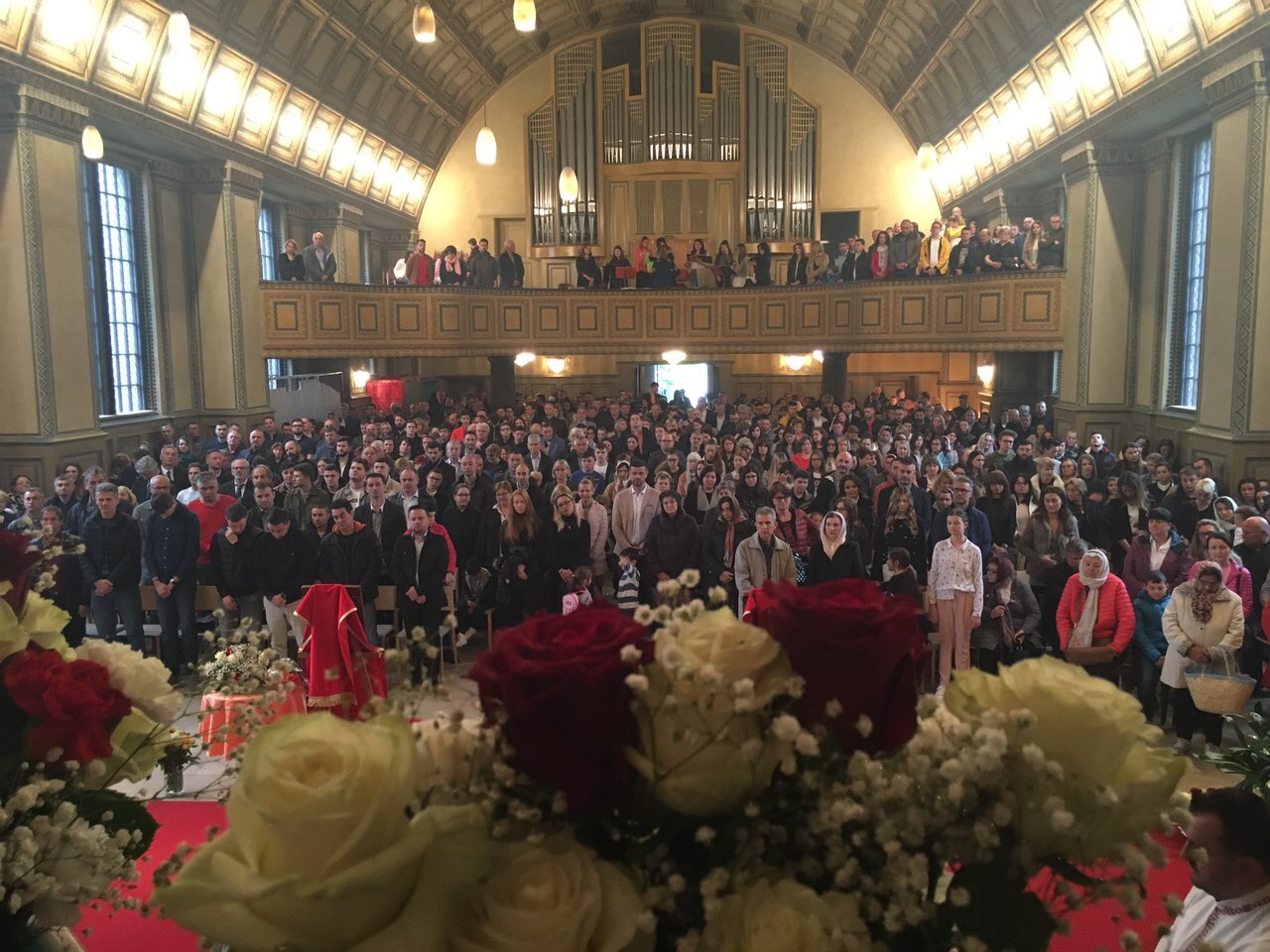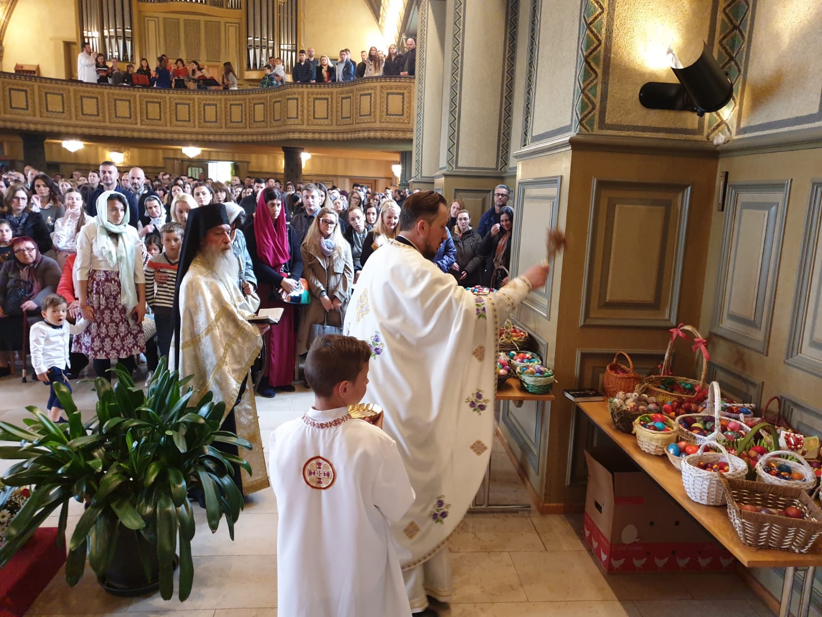 Празник над празницима, Васкрсење Христово је Божанственом литургијом прослављен у препуном храму Хајлигкројц уз појање парохијског хора, под диригентском палицом госпође Јасмине Матијевић Голник. После прочитаног Јеванђеља присутним верницима се беседом о Васкрсењу Господњем обратио надлежни парох свештеник Бране Сарић. Литургији је присуствовао високопреподобни архимандрит Козма из Цириха који је такође исповедао и причешћивао верни народ. На крају Литургије, после трократног свештеничког поздрава Христос васкрсе и народног отпоздрава Ваистину васкрсе, прочитана је посланица Његове Светости Патријарха српског Господина Иринеја, а свима присутнима су подељена васкршња јаја и антидор. Деци су дељени пакетићи са чоколадним јајима, прилогом и добротом породице Петра Митровића.