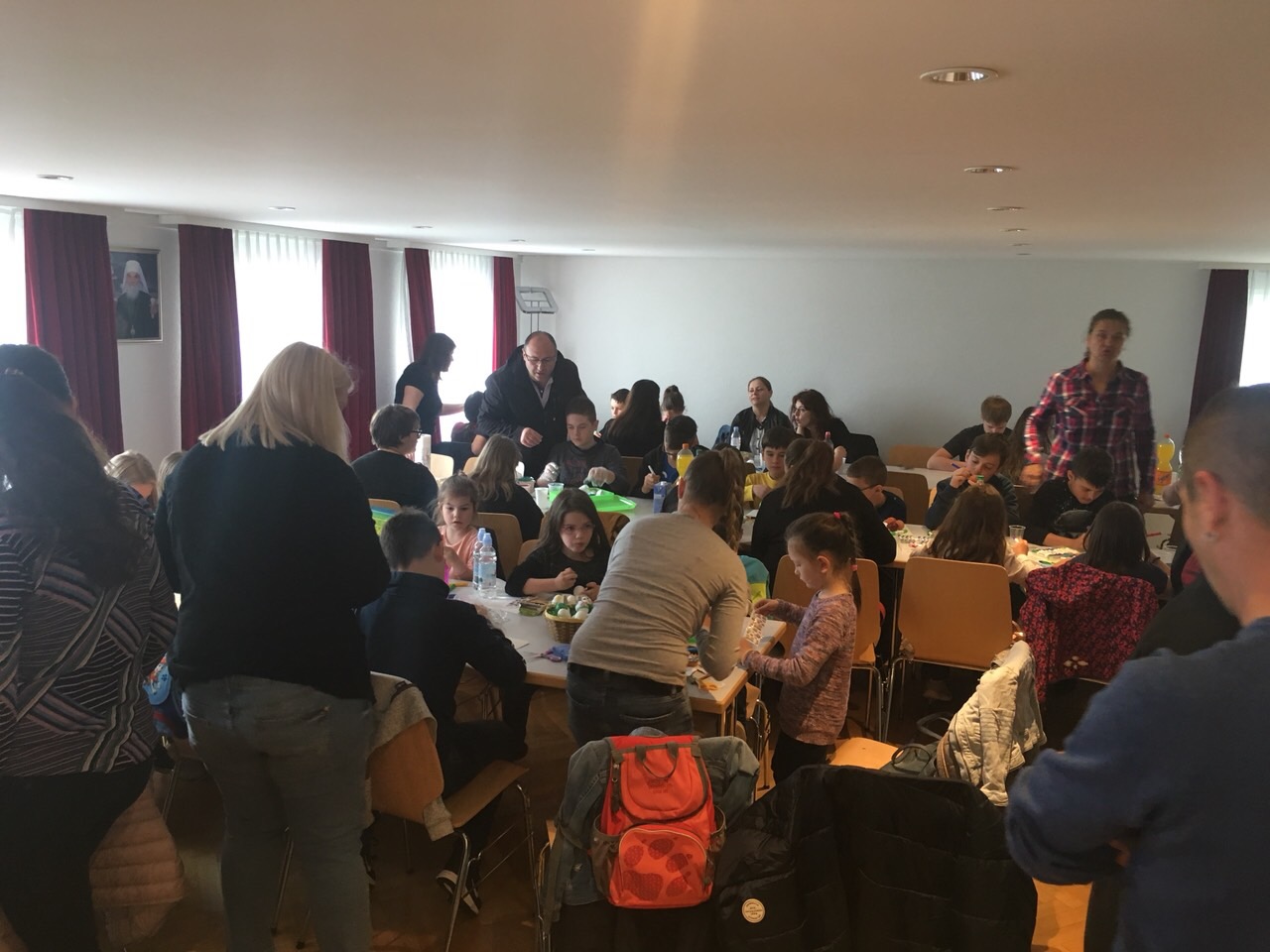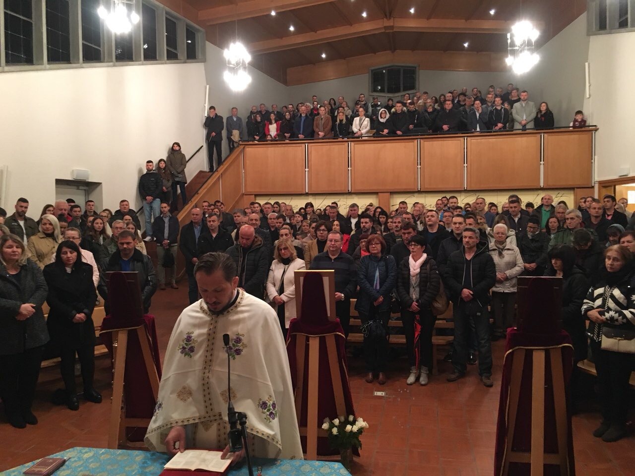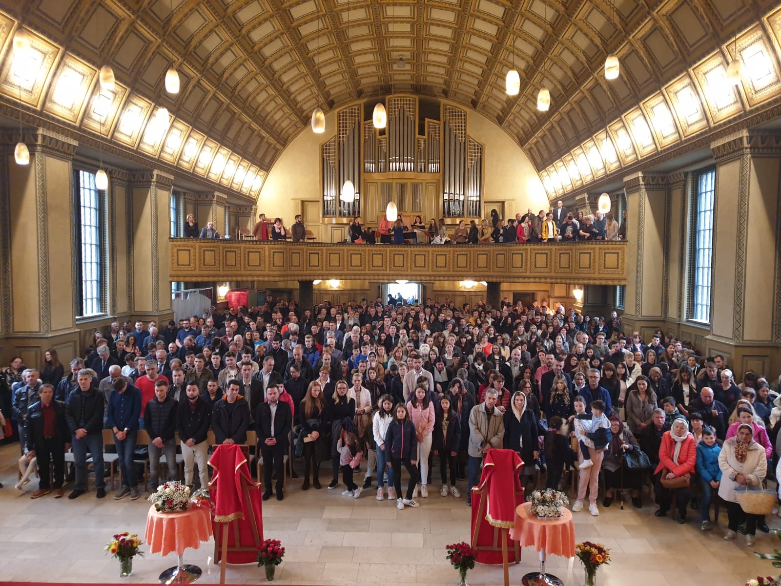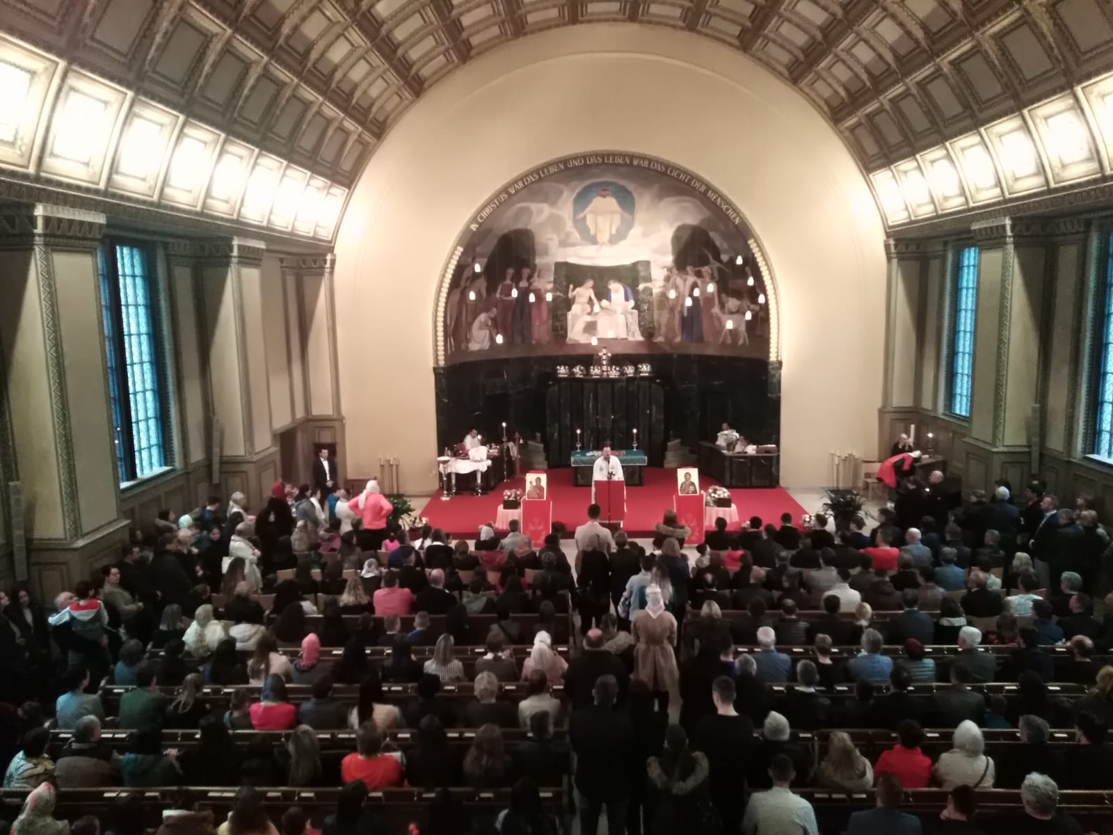 Празник над празницима, Васкрсење Христово је Божанственом литургијом прослављен у препуном храму Хајлигкројц уз појање парохијског хора, под диригентском палицом госпође Јасмине Матијевић Голник. После прочитаног Јеванђеља присутним верницима се беседом о Васкрсењу Господњем обратио надлежни парох свештеник Бране Сарић. Литургији је присуствовао високопреподобни архимандрит Козма из Цириха који је такође исповедао и причешћивао верни народ. На крају Литургије, после трократног свештеничког поздрава Христос васкрсе и народног отпоздрава Ваистину васкрсе, прочитана је посланица Његове Светости Патријарха српског Господина Иринеја, а свима присутнима су подељена васкршња јаја и антидор. Деци су дељени пакетићи са чоколадним јајима, прилогом и добротом породице Петра Митровића.
