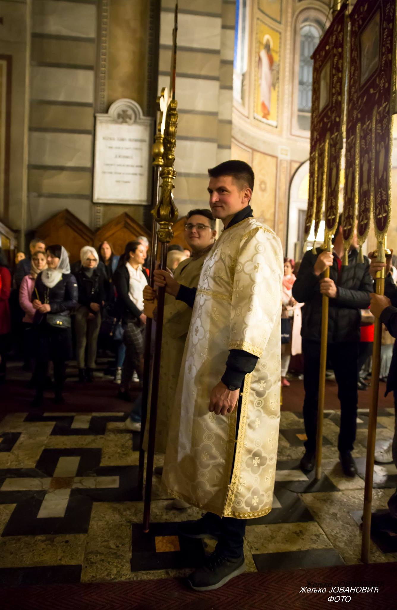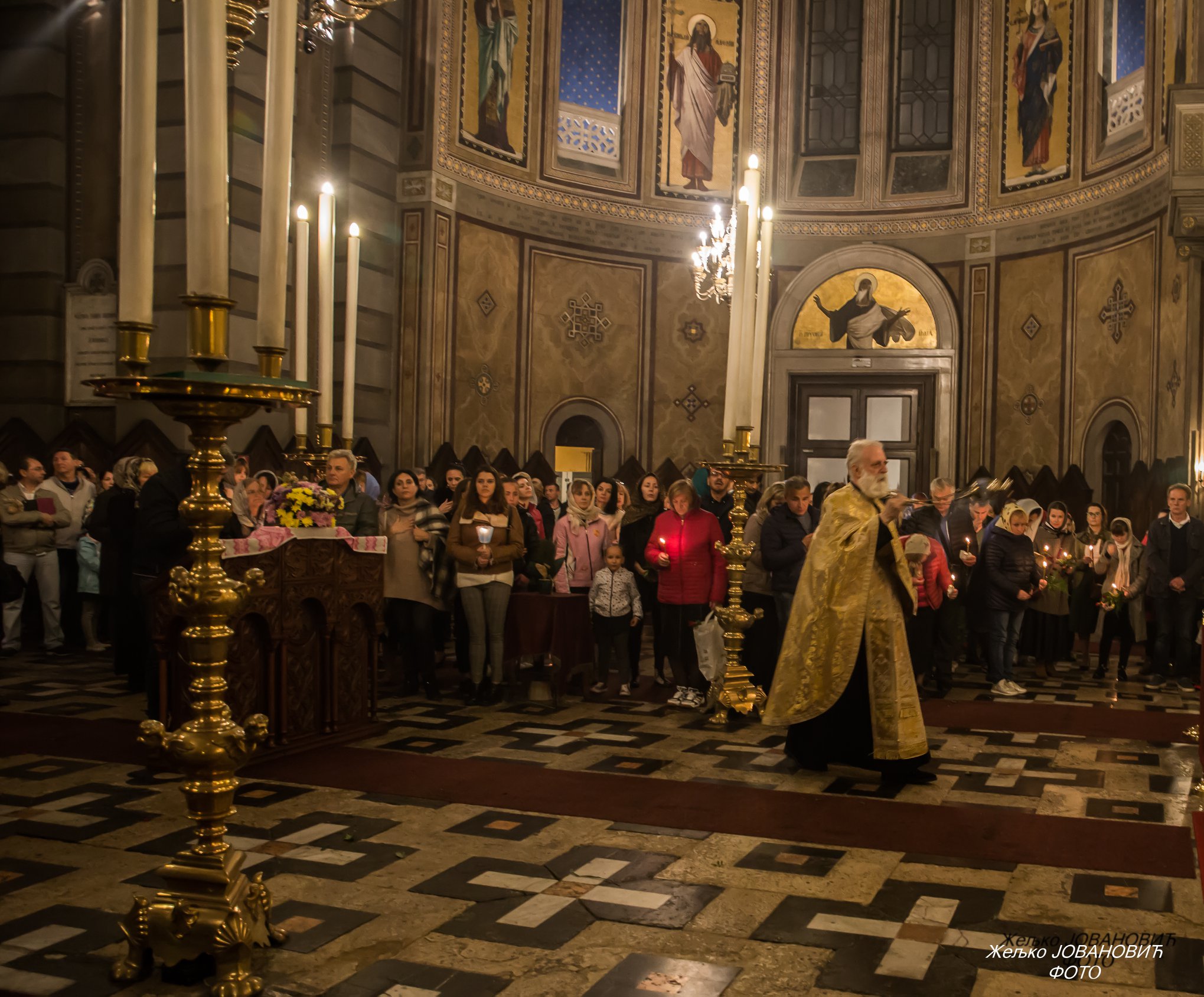 Васкршње јутарње са литијом око храма, у поноћ су служили отац Рашко Радовић и отац Душан Ђукановић уз појање храмовног хора. Након литије и чина Васкрсења пред храмом, настављена је јутарња служба, а затим је прочитана Васкршња посланица честитавши свима Празник над празницима.