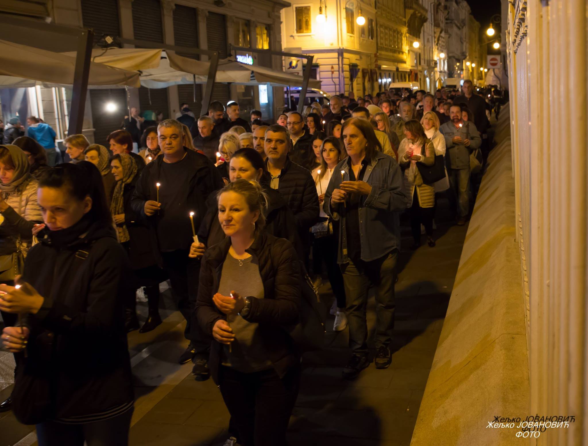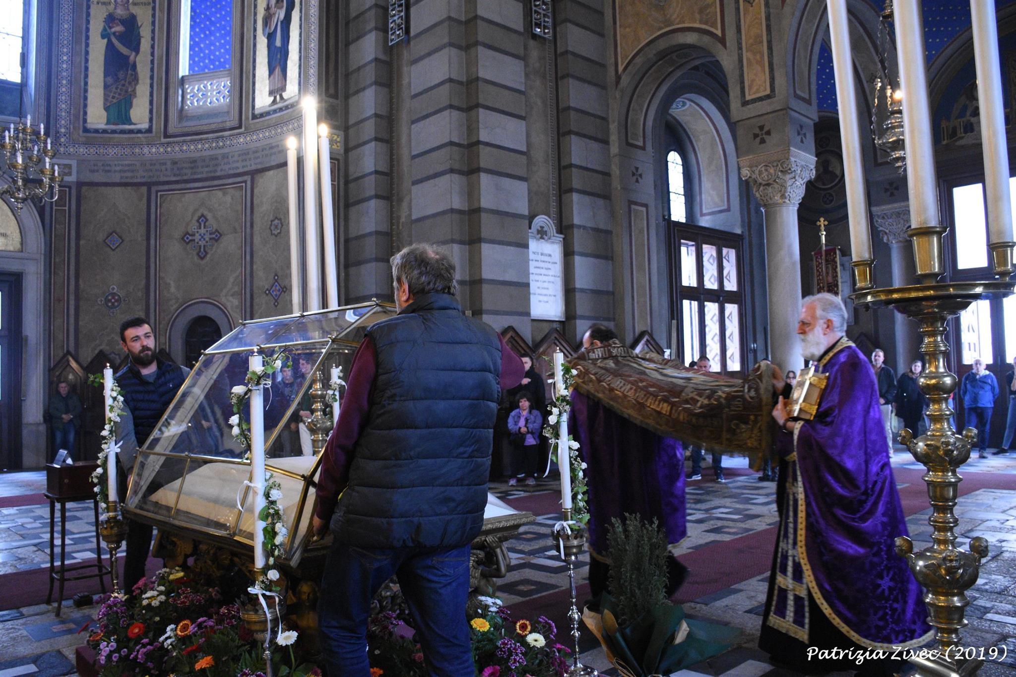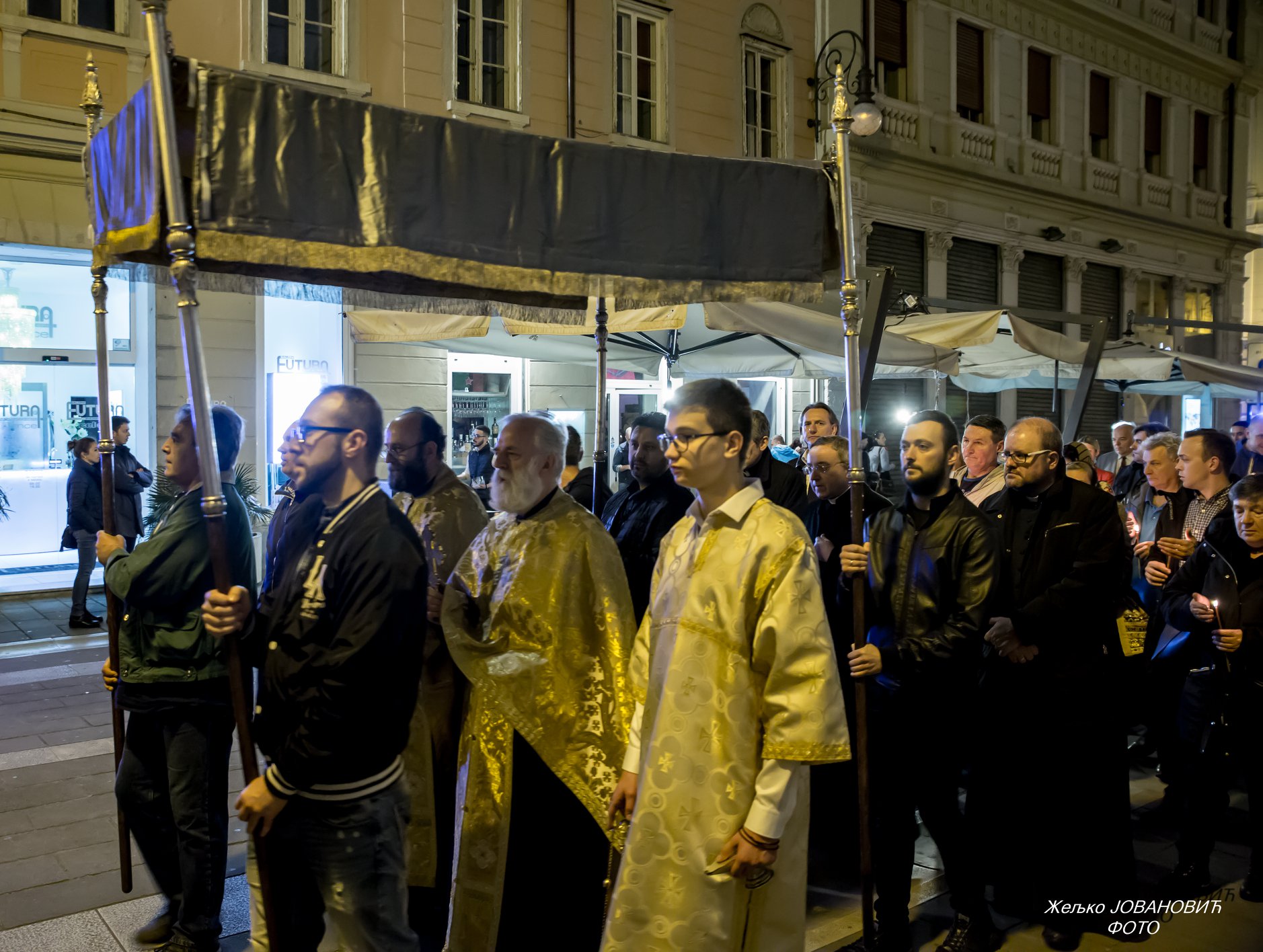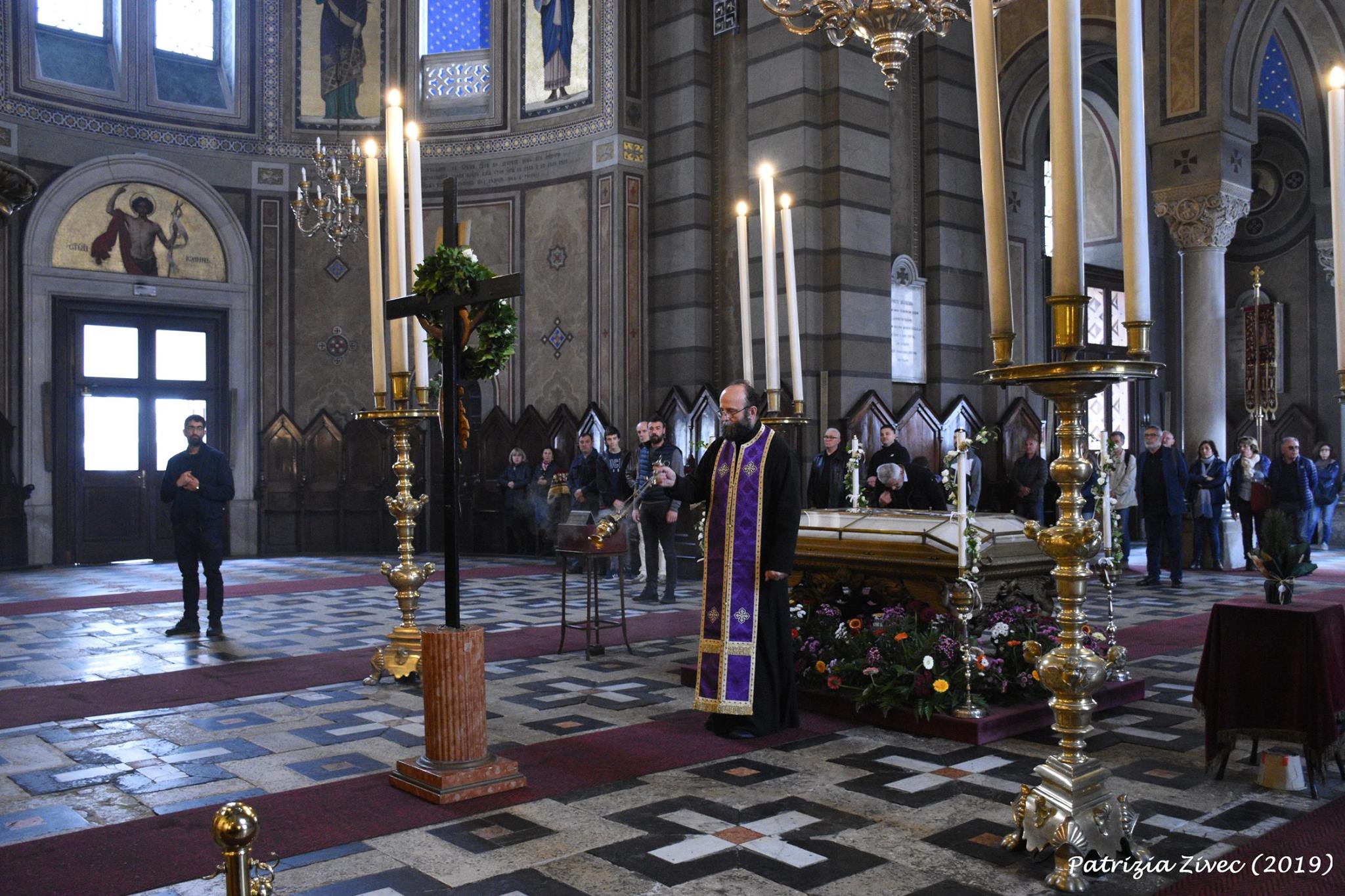 У храму Светог Спиридона Чудотворца у Трсту, вечерње богослужење са изношењем Плаштанице на Велики петак служили су протојереј-ставрофор Рашко Радовић, надлежни свештеник и јереј Душан Ђукановић, парох удинско-порчијски . Током службе је одговарао омладински октет. Након вечерње, служен је плач Мајке Божије, а затим и јутарње са Статијама уз трократни опход са Плаштаницом и појање свештеника и појаца.