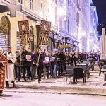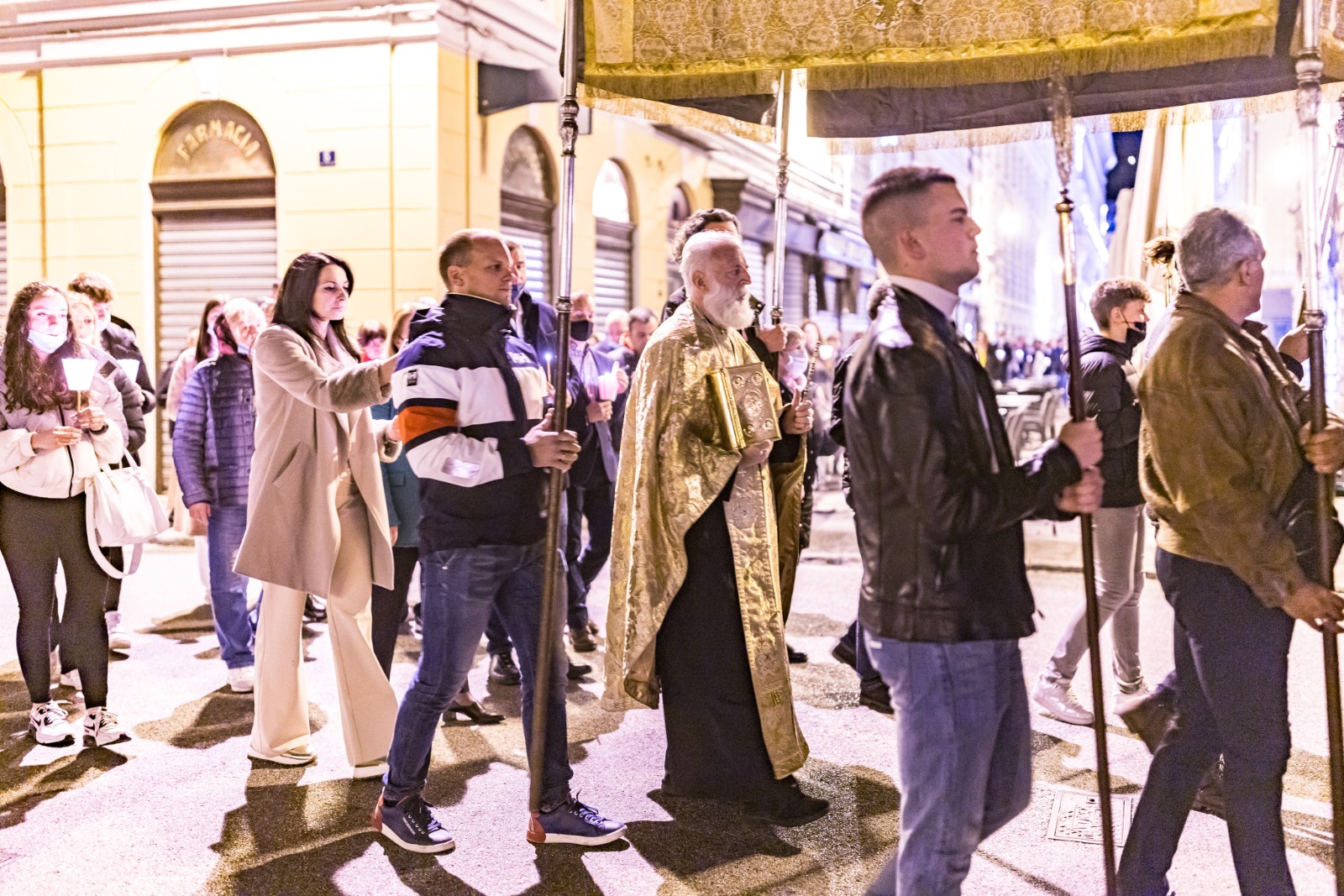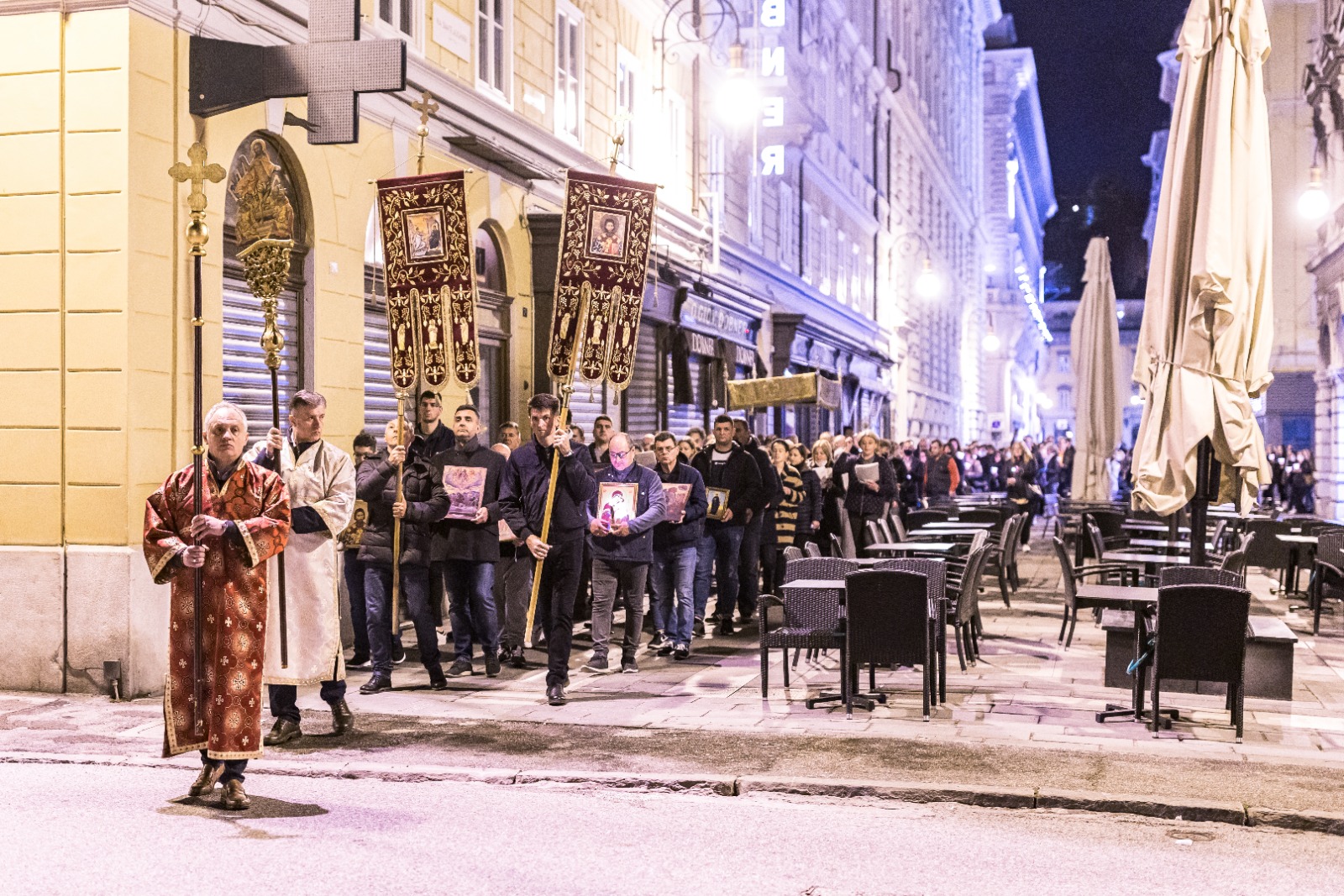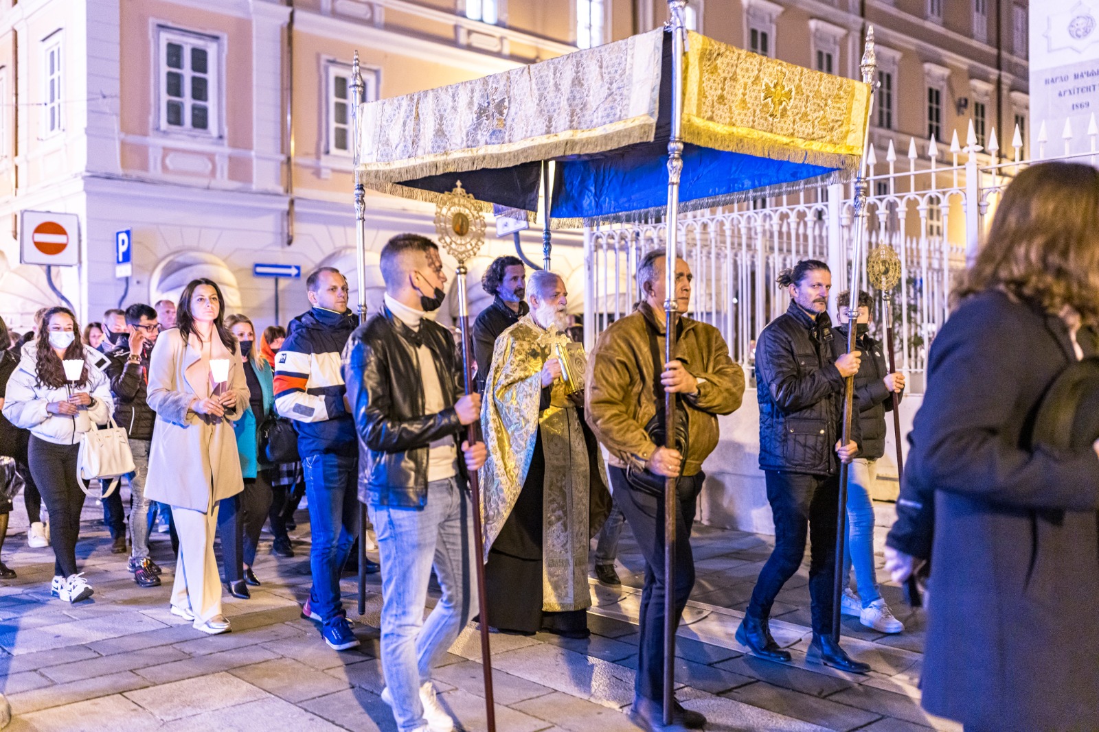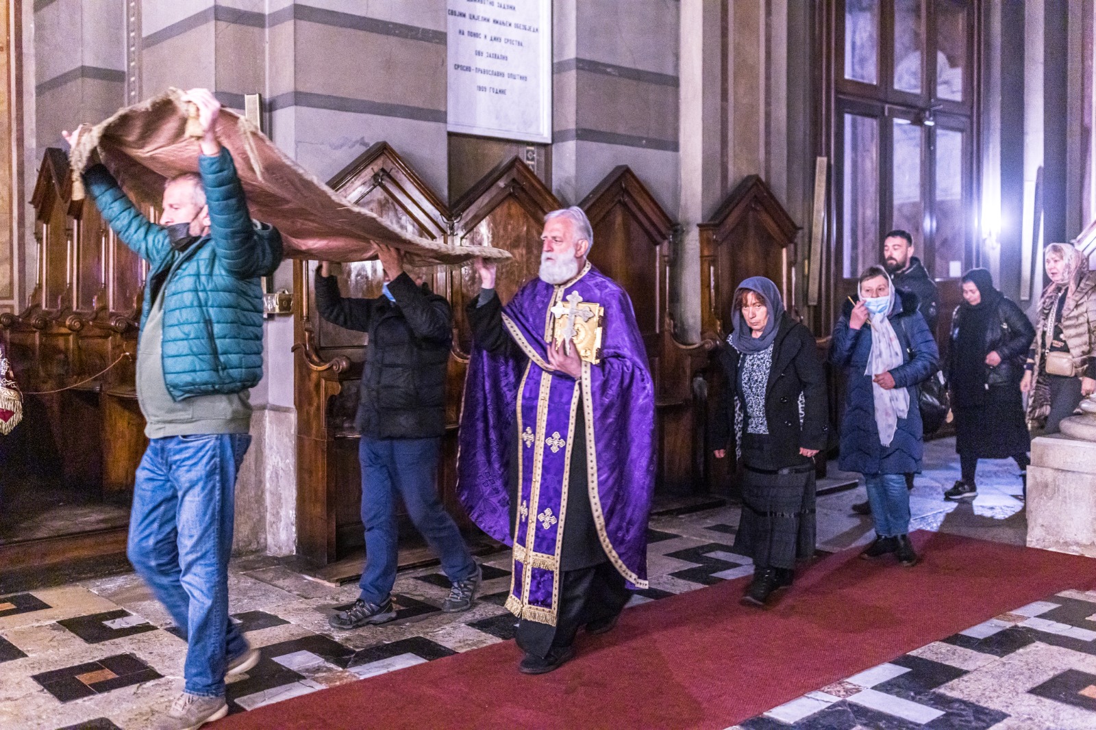 У храму Светог Спиридона Чудотворца у Трсту, Вечерње богослужење са изношењем Плаштанице на Велики петак служио је надлежни свештеник, протојереј-ставрофор Рашко Радовић. Током службе одговарао је храмовни хор. Након вечерње, служен је плач Мајке Божије, а затим и јутрење са статијама уз трократни опход са Плаштаницом и појањем свештеника и појаца.