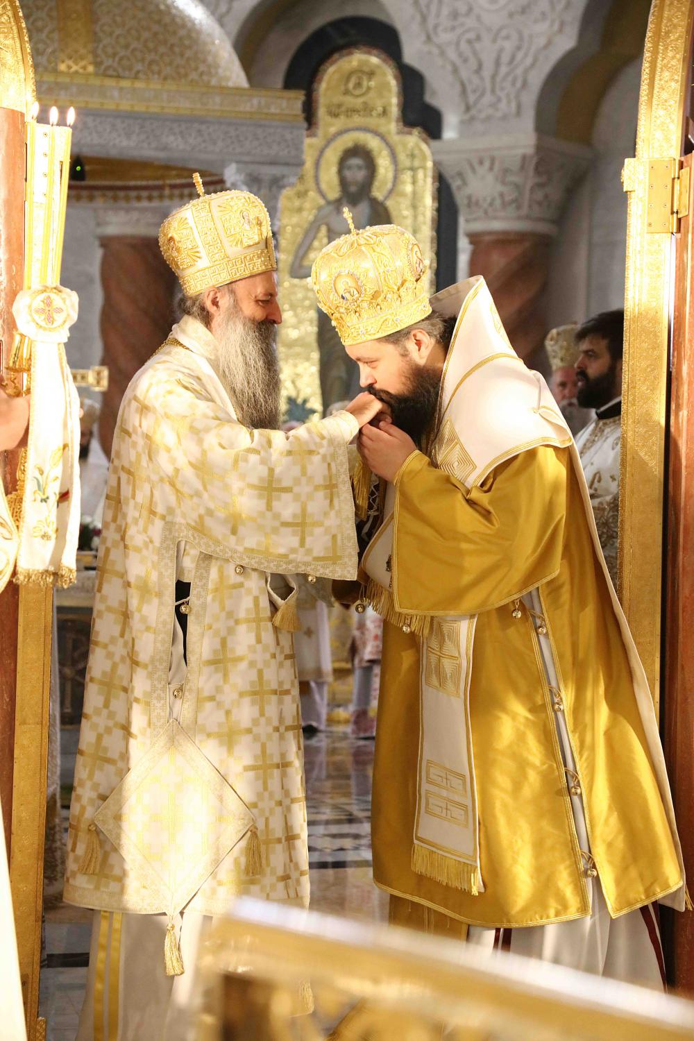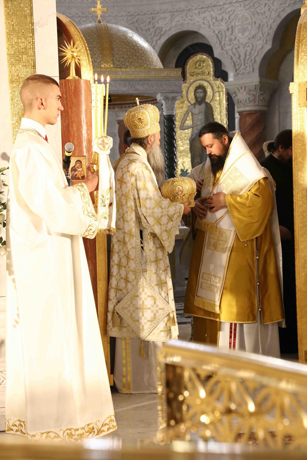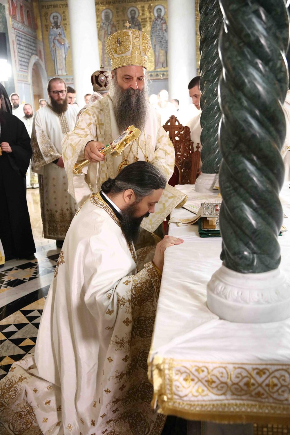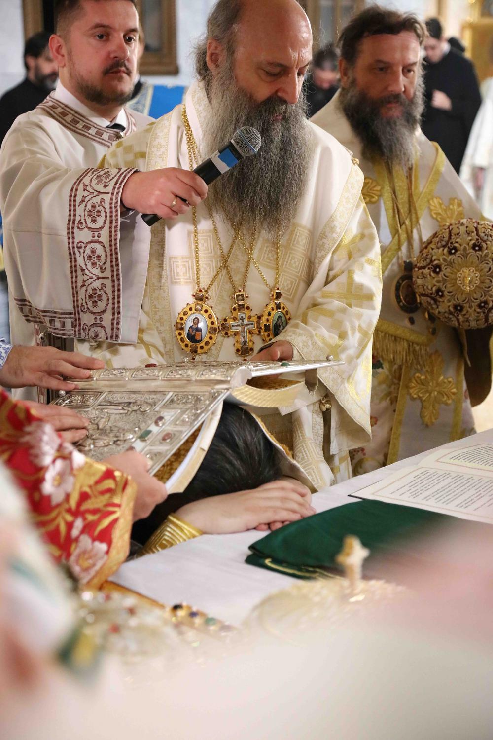 Након тог чина Патријарх Порфирије је предао Јеванђеље изабраном и нареченом Епископу, те су га затим увели у олтар на јужне двери. Одмах затим је почела света архијерејска Литургија, да би, након Трисвете песме, два протопрезвитера извела из ђаконика изабранога за хиротонију и довели га на солеју пред Царске двери, одакле је вођен двојицом архијереја уведен у олтар где је трипут обишао Часну Трпезу, чиме је и отпочео чин хиротоније. Након тога, архијереји су привели изабраног Епископа пред Часну Трпезу, где му је Патријарх на главу положио омофор, а архијереји отворено Јеванђеље. Потом су сви положили руке на њега, док је Патријарх читао молитве хиротоније.