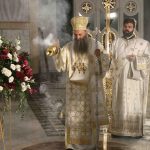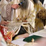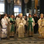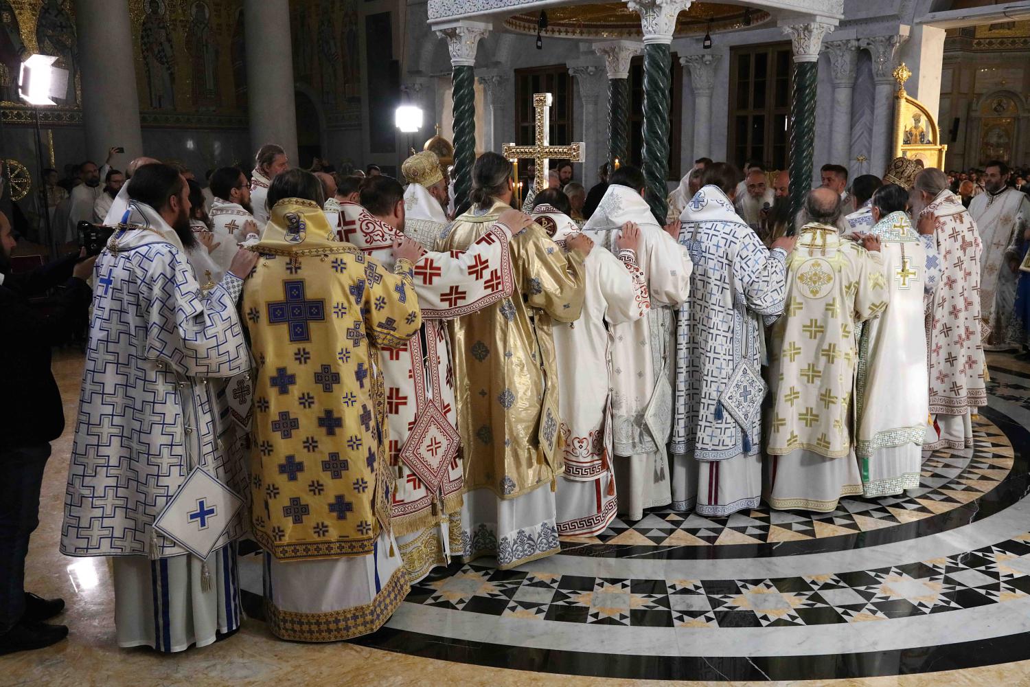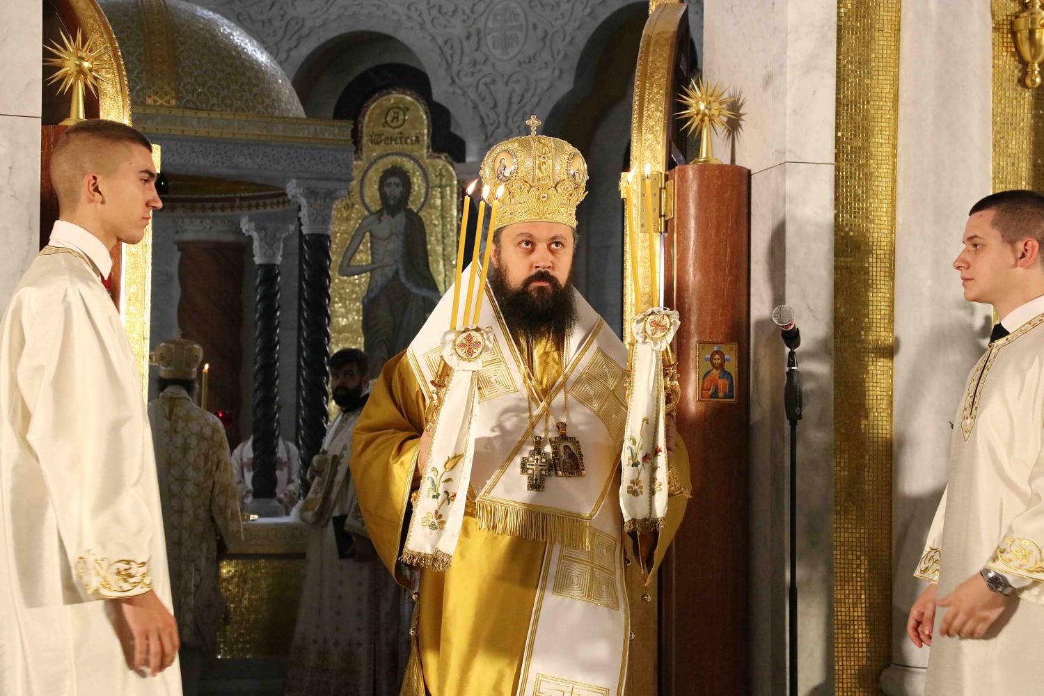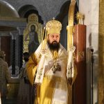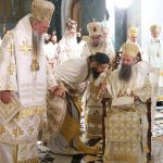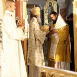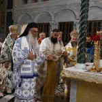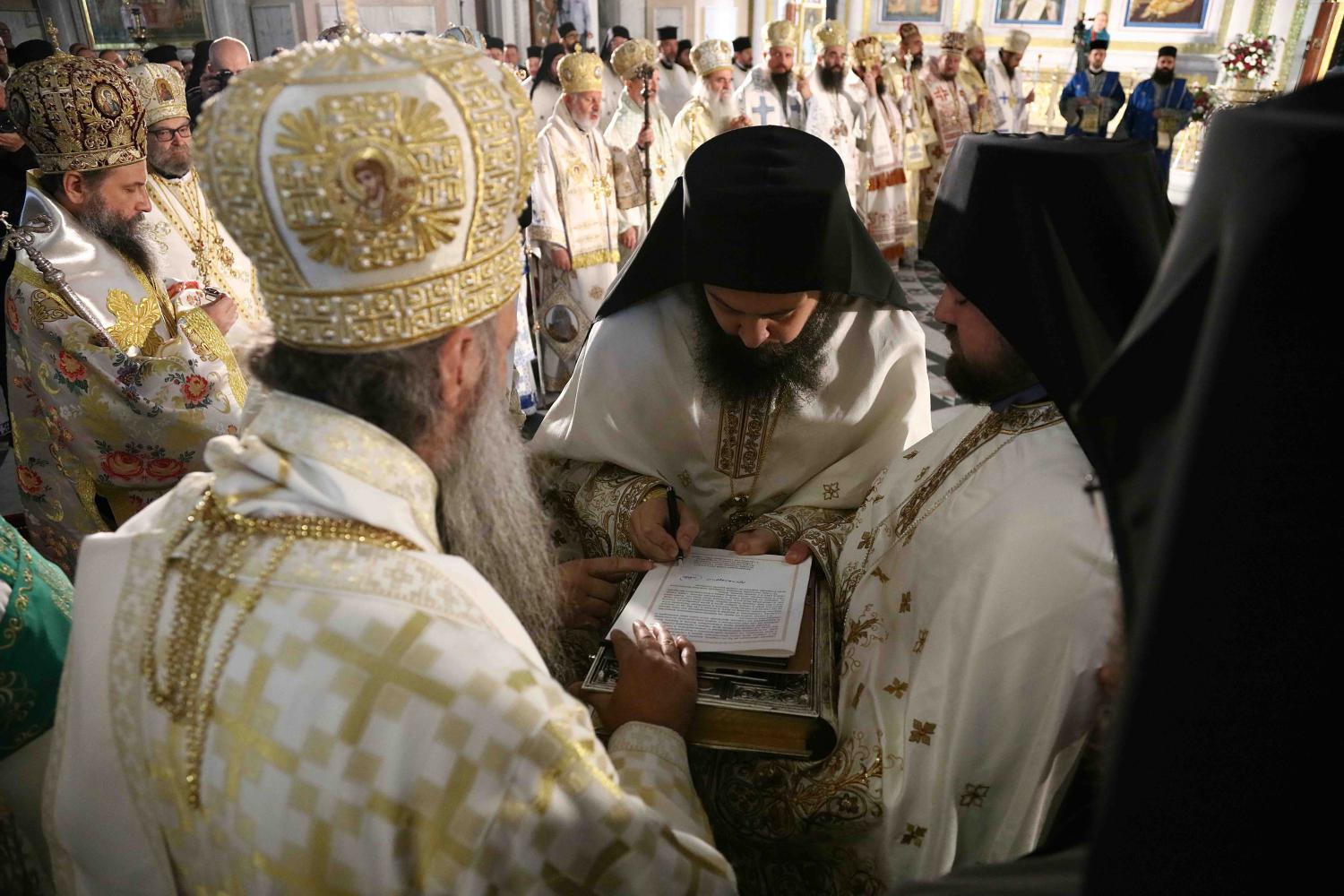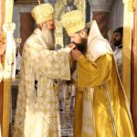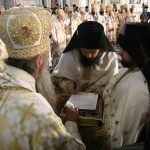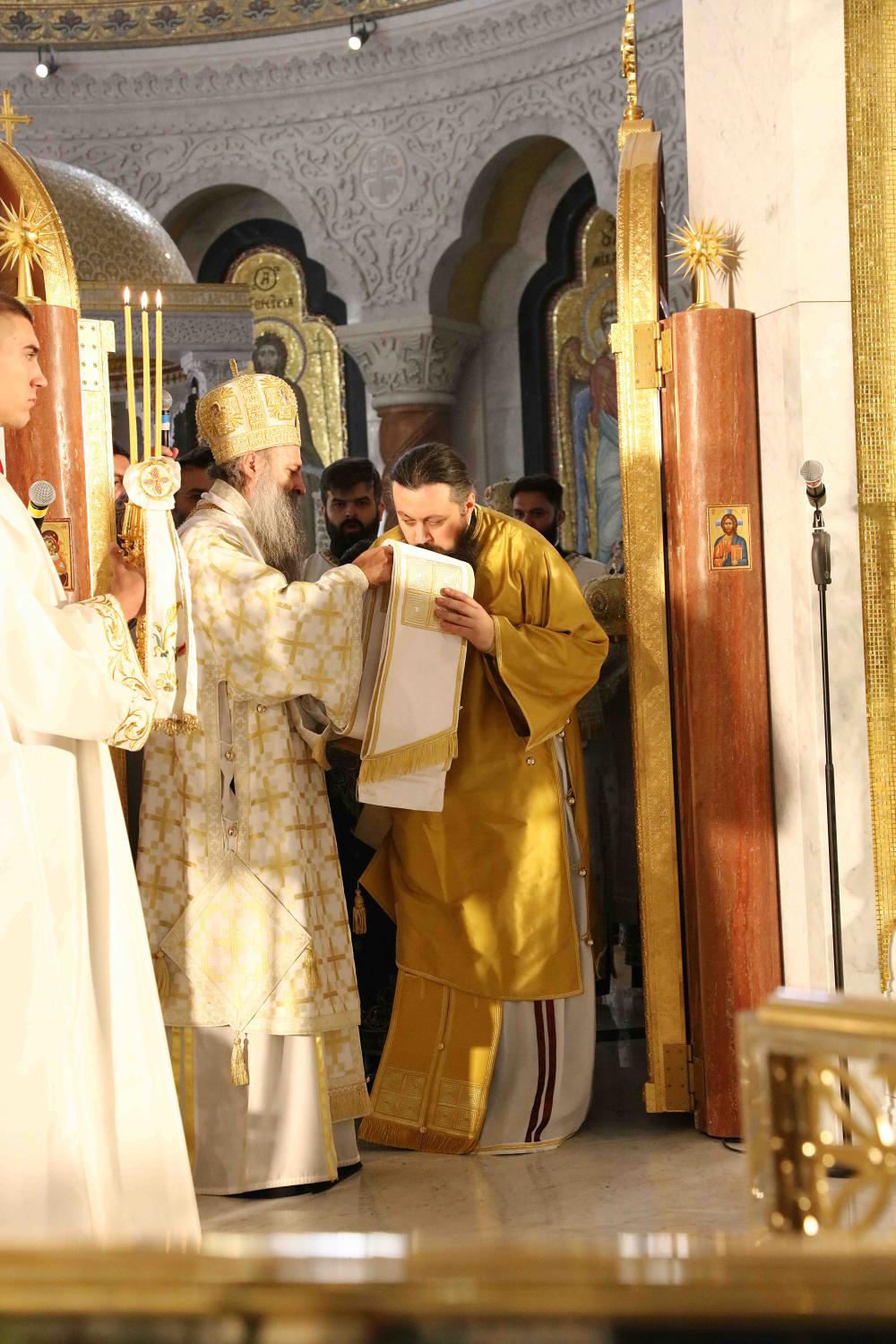Након тог чина Патријарх Порфирије је предао Јеванђеље изабраном и нареченом Епископу, те су га затим увели у олтар на јужне двери. Одмах затим је почела света архијерејска Литургија, да би, након Трисвете песме, два протопрезвитера извела из ђаконика изабранога за хиротонију и довели га на солеју пред Царске двери, одакле је вођен двојицом архијереја уведен у олтар где је трипут обишао Часну Трпезу, чиме је и отпочео чин хиротоније. Након тога, архијереји су привели изабраног Епископа пред Часну Трпезу, где му је Патријарх на главу положио омофор, а архијереји отворено Јеванђеље. Потом су сви положили руке на њега, док је Патријарх читао молитве хиротоније.