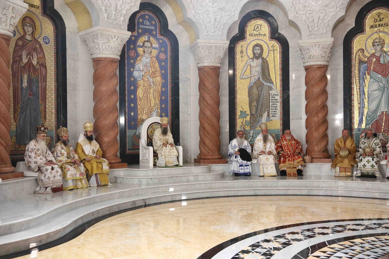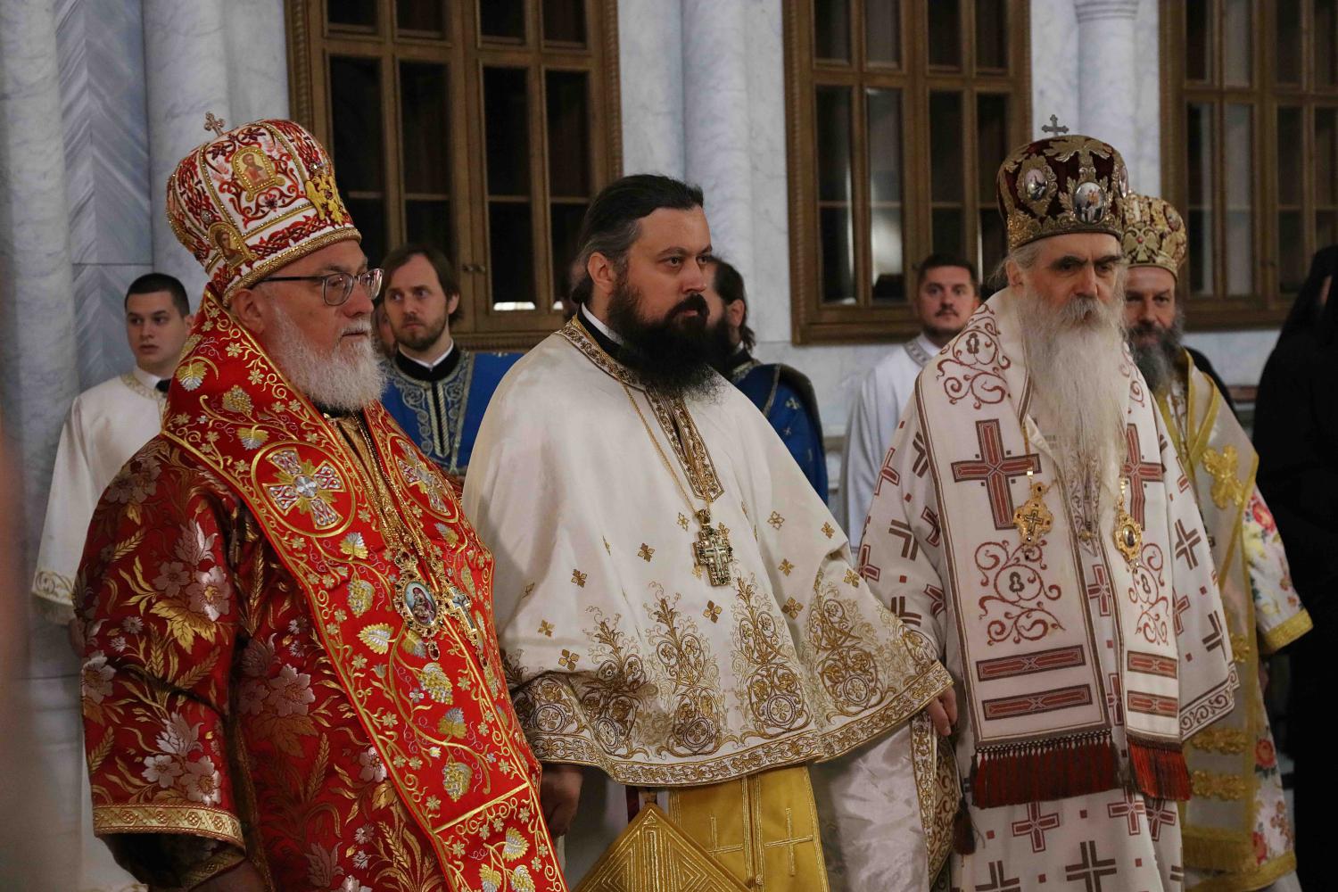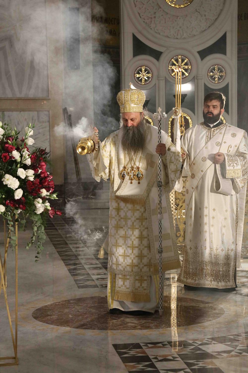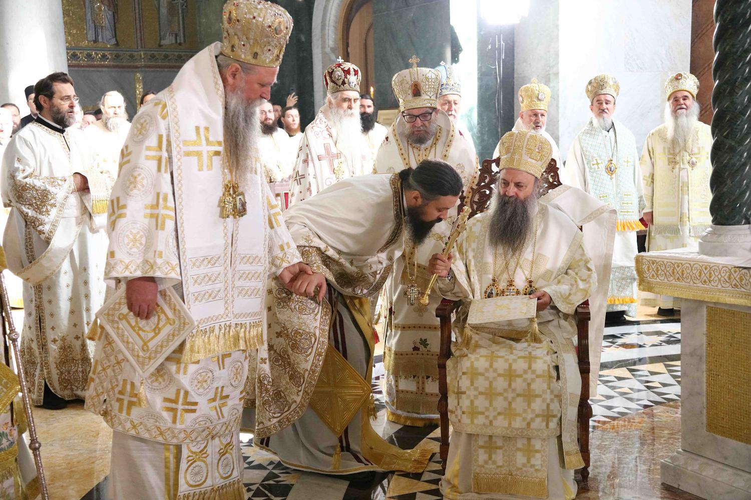 Његовој Светости Патријарху Порфирију саслуживали су Архиепископ мадавски г. Аристовул из Јерусалимске Патријаршије, Архиепископ охридски и Митрополит скопски г. Јован, Митрополит црногорско-приморски г. Јоаникије и господа Епископи: будимски Лукијан, банатски Никанор, бачки Иринеј, британско-скандинавски Доситеј, врањски Пахомије, шумадијски Јован, браничевски Игнатије, зворничко-тузлански Фотије, милешевски Атанасије, горњокарловачки Герасим, крушевачки Давид, славонски Јован, бихаћко-петровачки Сергије, тимочки Иларион, нишки Арсеније, далматински Никодим, осечкопољски и барањски Херувим, ваљевски Исихије, будимљанско-никшићки Методије, захумско-херцеговачки Димитрије, моравички Антоније, стобијски Давид, ремезијански Стефан, топлички Јеротеј, хвостански Јустин и мохачки Дамаскин.