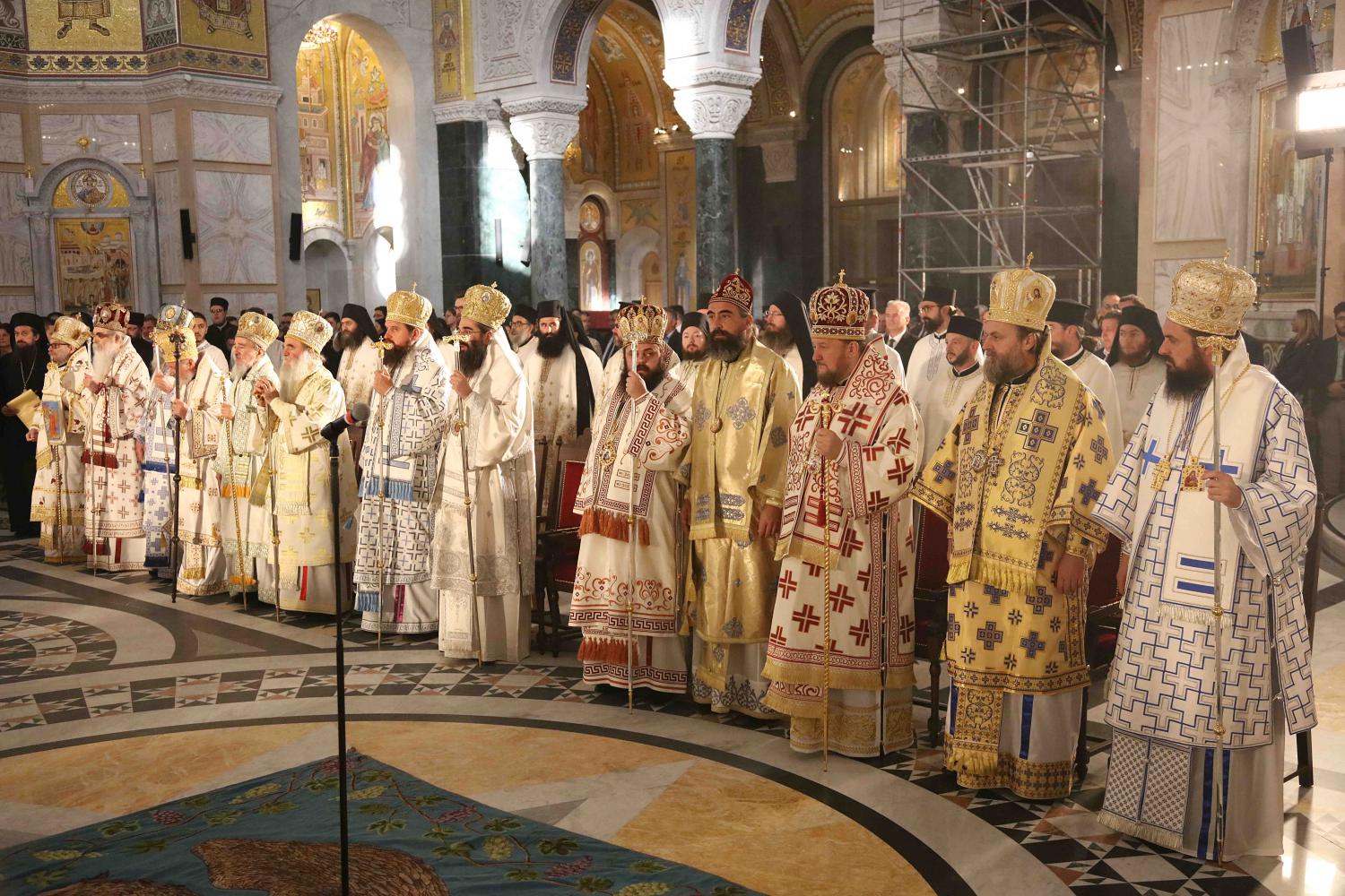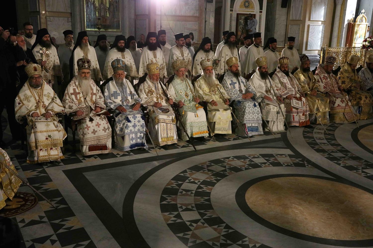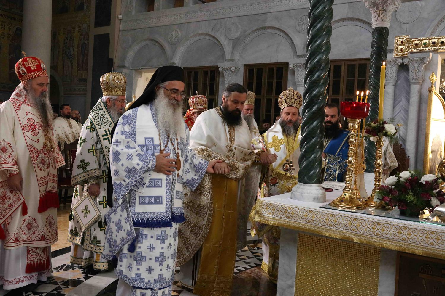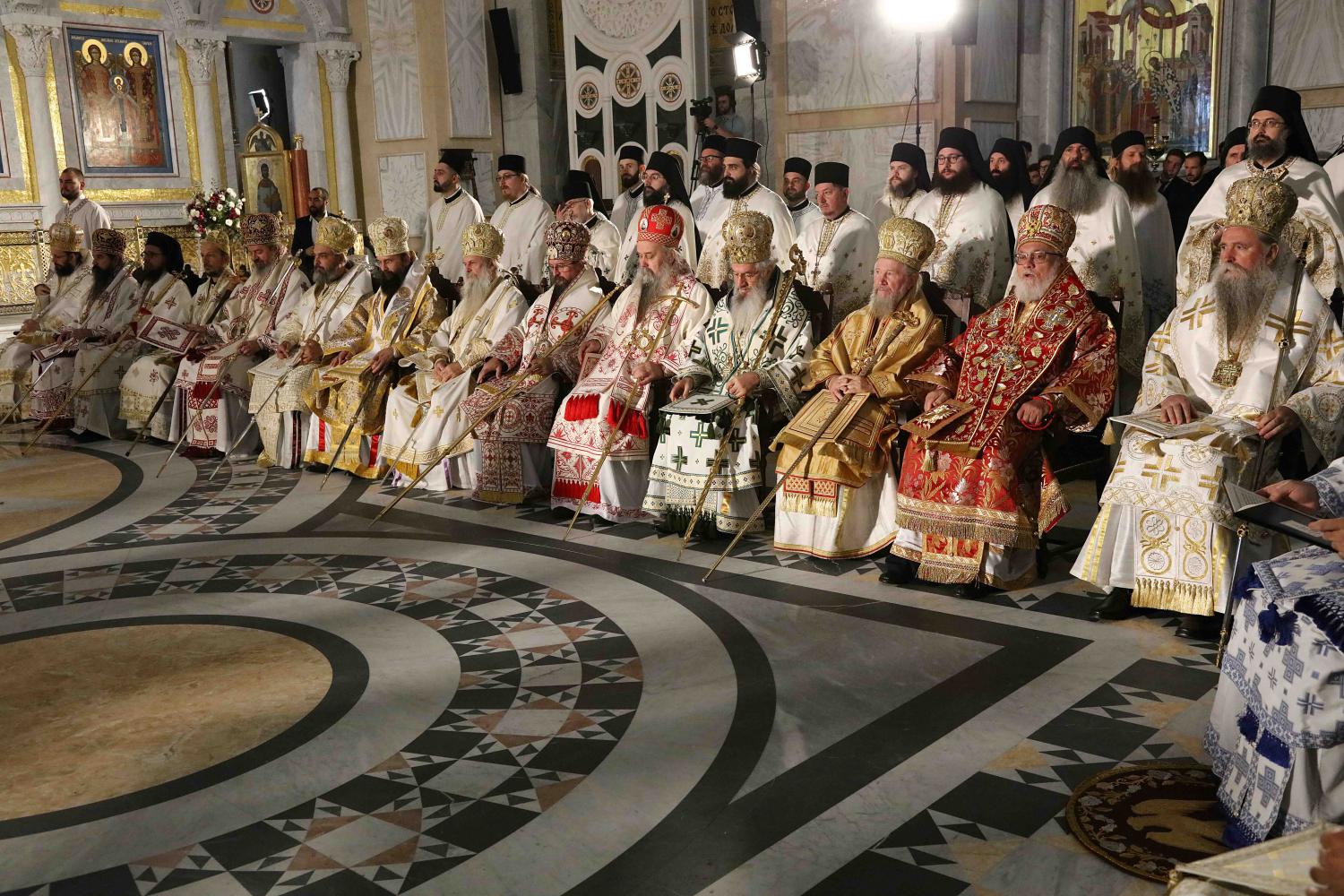 Његовој Светости Патријарху Порфирију саслуживали су Архиепископ мадавски г. Аристовул из Јерусалимске Патријаршије, Архиепископ охридски и Митрополит скопски г. Јован, Митрополит црногорско-приморски г. Јоаникије и господа Епископи: будимски Лукијан, банатски Никанор, бачки Иринеј, британско-скандинавски Доситеј, врањски Пахомије, шумадијски Јован, браничевски Игнатије, зворничко-тузлански Фотије, милешевски Атанасије, горњокарловачки Герасим, крушевачки Давид, славонски Јован, бихаћко-петровачки Сергије, тимочки Иларион, нишки Арсеније, далматински Никодим, осечкопољски и барањски Херувим, ваљевски Исихије, будимљанско-никшићки Методије, захумско-херцеговачки Димитрије, моравички Антоније, стобијски Давид, ремезијански Стефан, топлички Јеротеј, хвостански Јустин и мохачки Дамаскин.