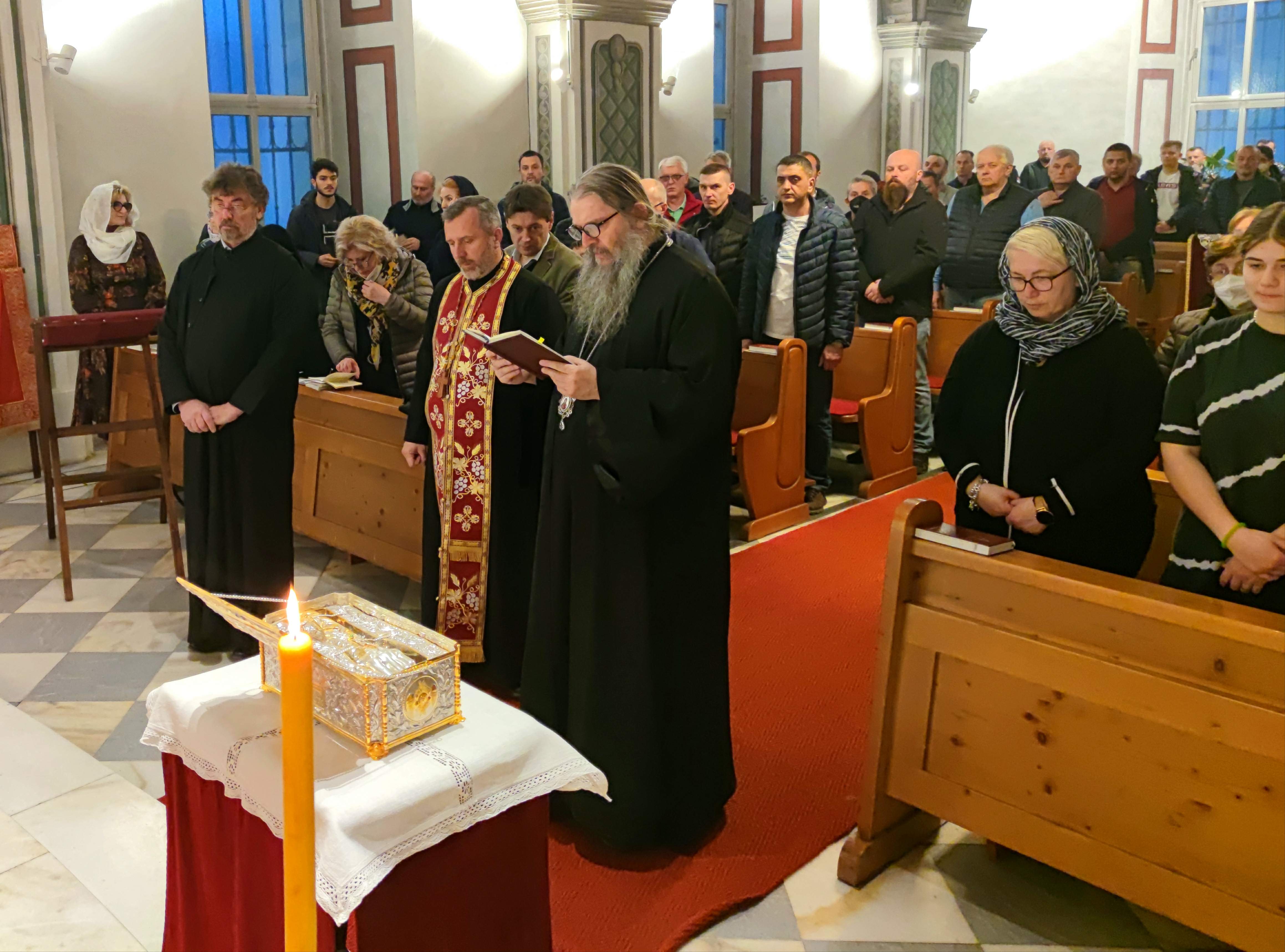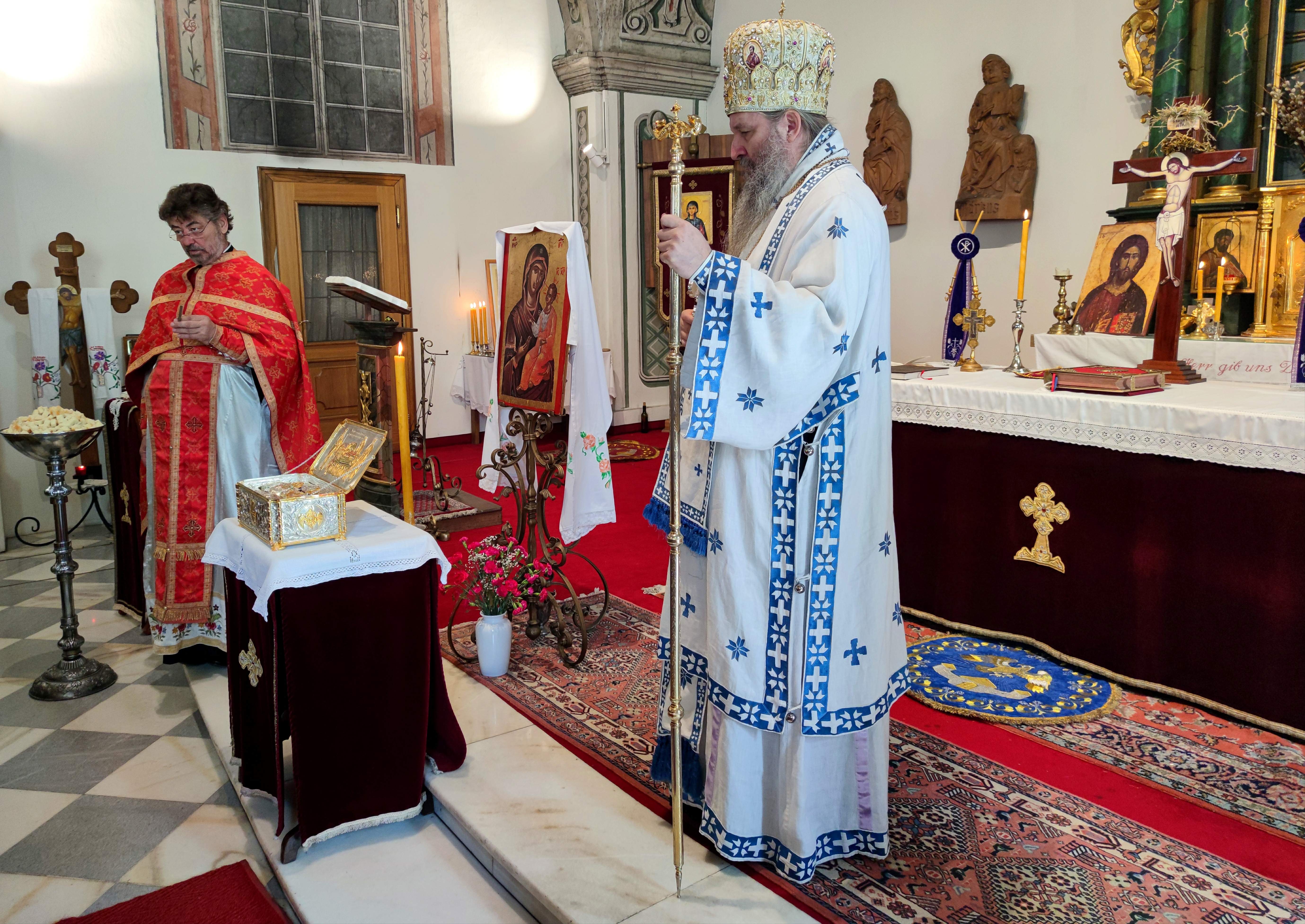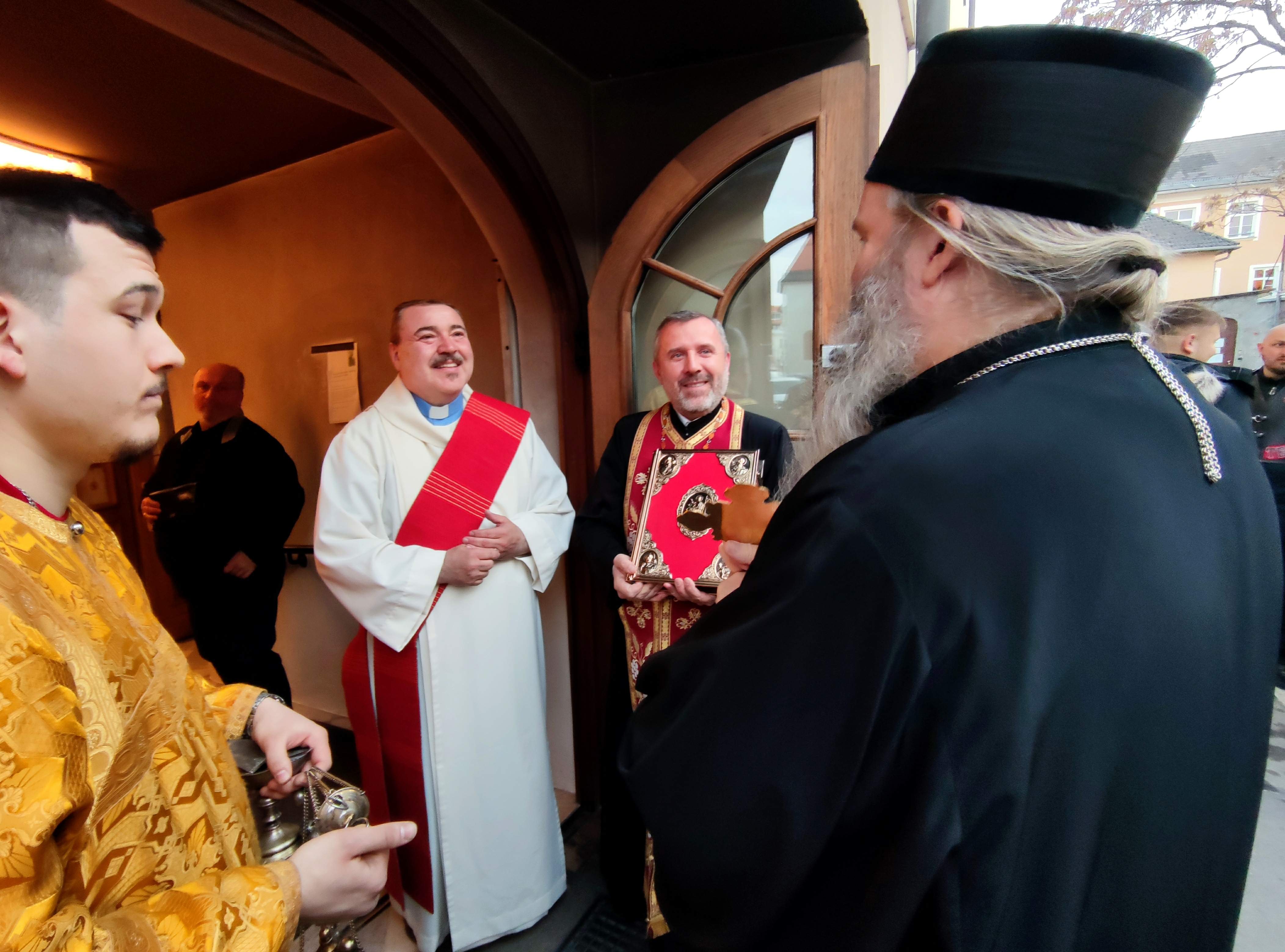 Уочи Треће недеље Васкршњег Поста, 25. марта 2022. године, Његово Преосвештенство Епископ аустријско-швајцарски, Италије и Малте Г. Андреј, у пратњи дипл. теол. Александра Савића из Беча, допутовао је у дводневну посету Црквеној општини Преподобне Мајке Параскеве у Клагенфурту. Испред храма, Преосвећеног Епископа је свечано дочекао надлежни парох јереј Љубомир Радованов заједно са месним парохом Румунске Православне Цркве о. Висарионом и ђаконом старокатоличке цркве Томасом Шолцем.
