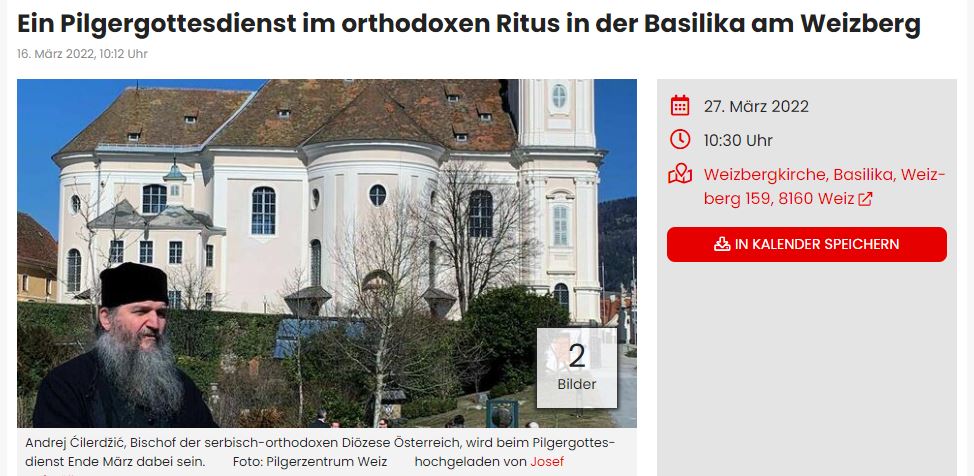 У недељу, 27. марта 2022. године, Његово Преосвештенство Епископ аустријско-швајцарски Г. Андреј служиће православну Божанствену литургију Светог Василија Великог у Базилици ходочашћа у штајерском градићу Аустрије Вајцу, на позив Управе мировног покрета Пут наде.