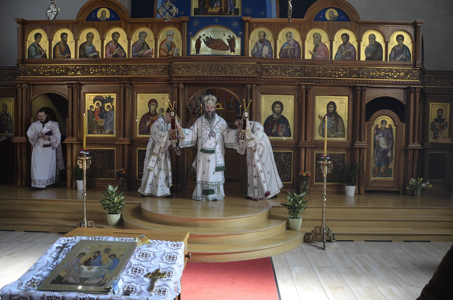 Епископу су саслуживали протојереј Мирослав Симијоновић, архимандрит Козма Бихл, настојатељ храма јереј Бранимир Петковић и ђакон Бране Сарић. Поред изобиља благодати Божије началствовањем Архијереја на Светој Литургији, свечаност је увеличана пред сам почетак чина Свете Евхаристије рукопроизвођењем у ипођаконâ дипломираних теолога, чтечева Ивана Толића и Сашe Бранисављевића.
